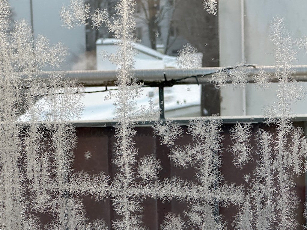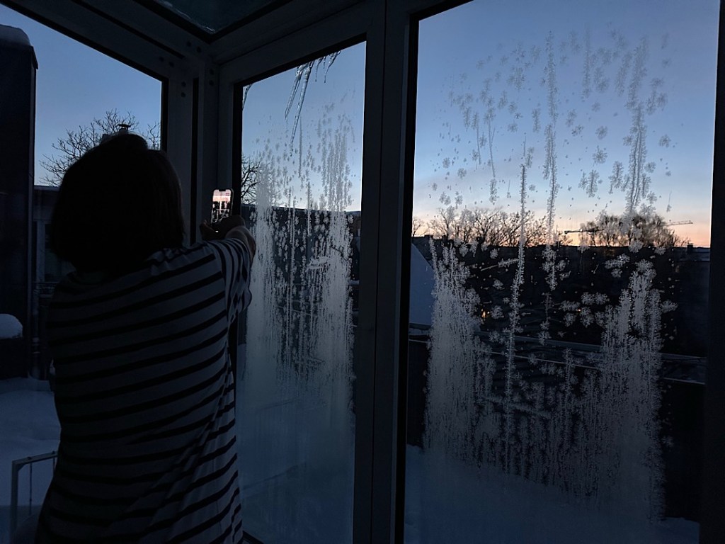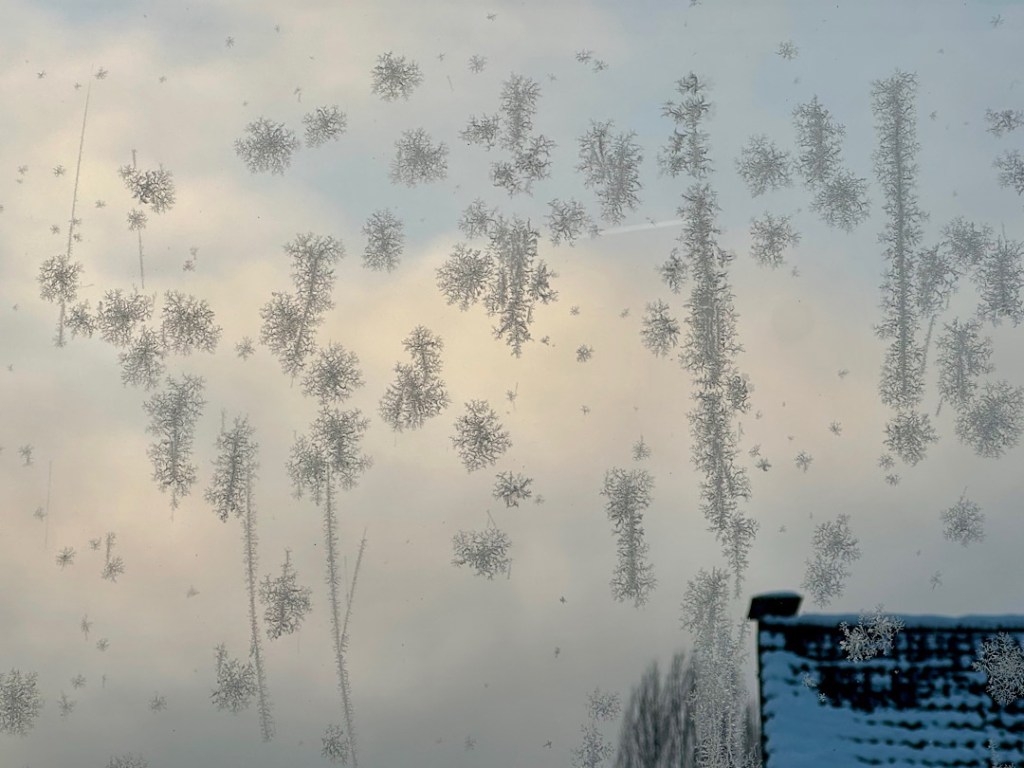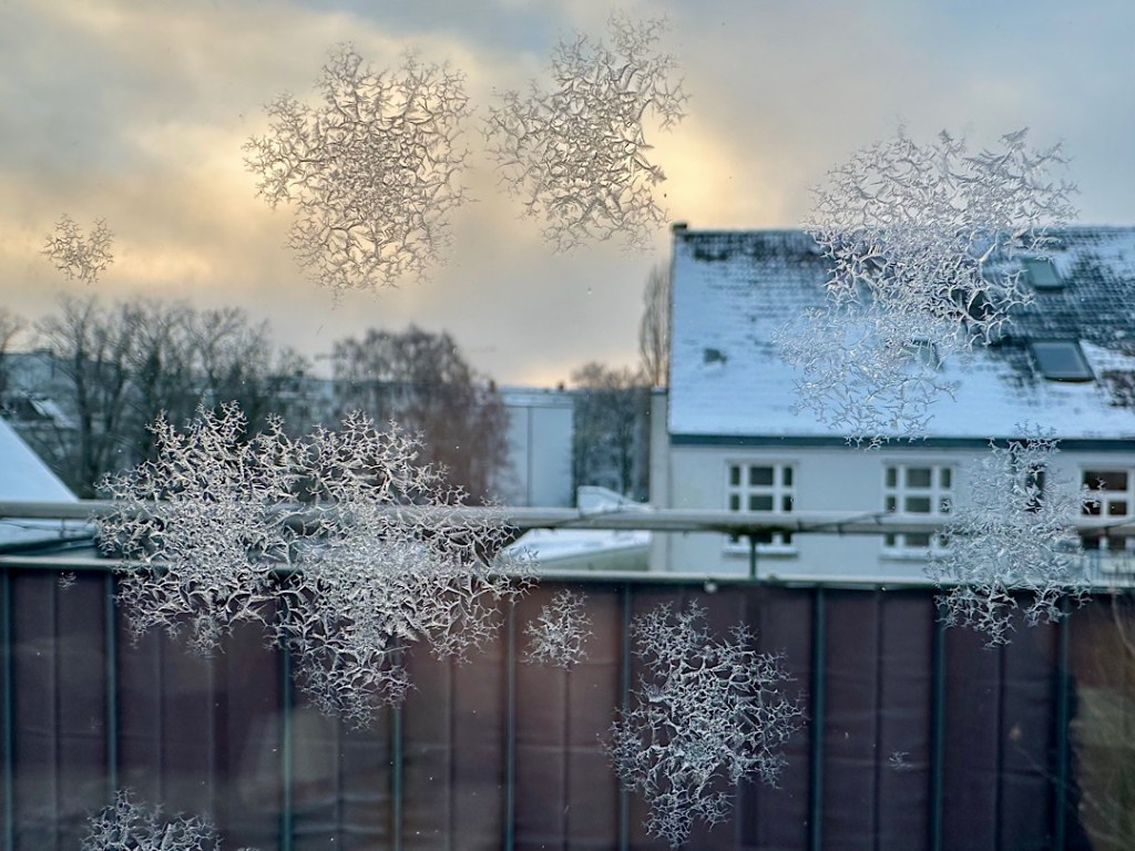 Das ist ein seltener gewordener Anblick, denn während sich früher Eisblumen oft INNEN an schlecht isolierenden Einfachverglasungen bildeten, weil die wärmere (und feuchtere) Innenluft an der eiskalten Scheibe gefror, kommt das bei guter Thermo-Verglasung eben kaum mehr vor. An der Dreifach-Verglasung unseres Wintergartens haben sich die Eisblumen deshalb gebildet, weil die äußere Scheibe nach der eiskalten Nacht von etwas wärmerer Alsterluft gestreift wurde. Um kleine Staubpartikel oder Wischlinien vom Fensterputzen herum bilden sich dann Eiskristalle. Dafür gab es offenbar nur ein ganz kleines Temperaturband, denn an allen anderen Fenstern hatten wir keine Eisblumen. Nur im Wintergarten an Fenstern, die keinen Überhang durch das Dach oder die Treppe haben.