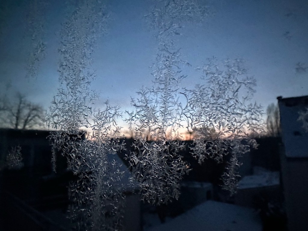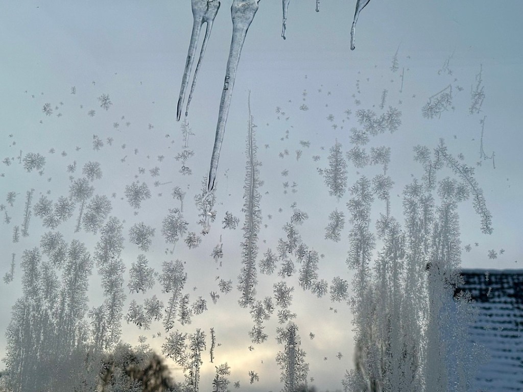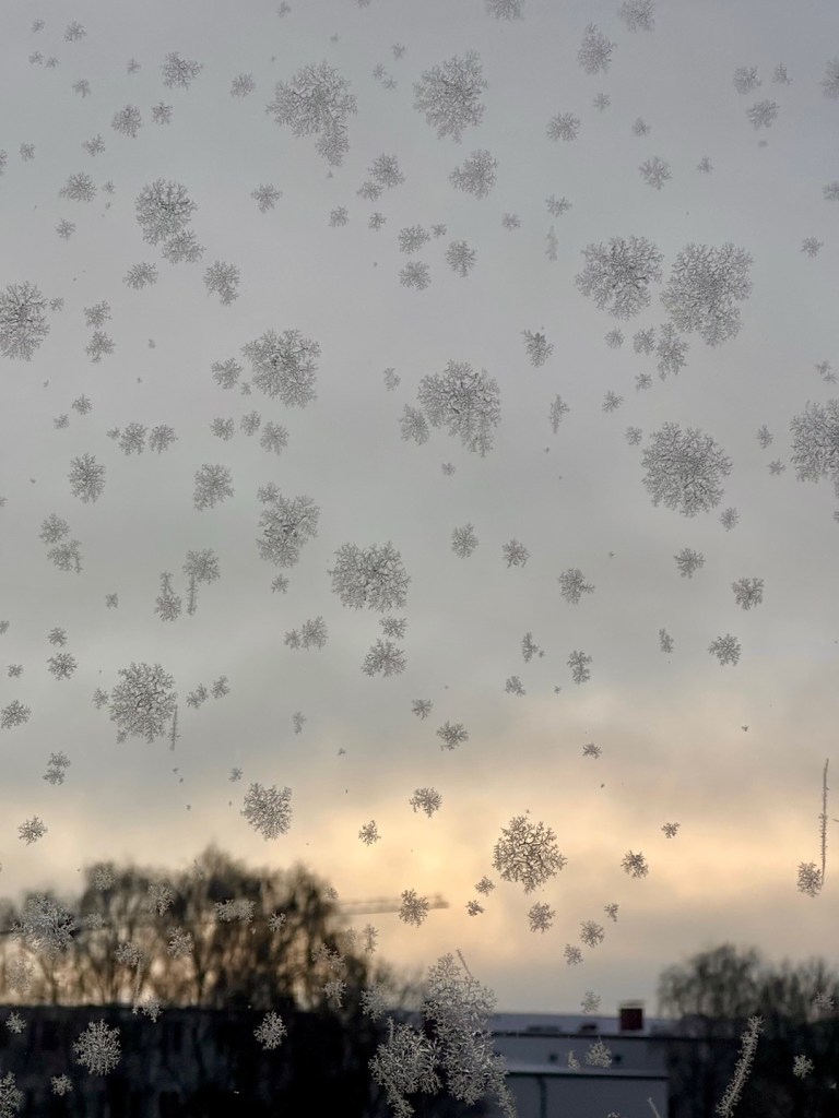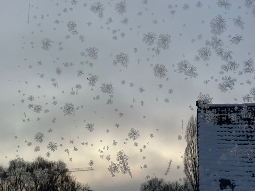Das ist ein seltener gewordener Anblick, denn während sich früher Eisblumen oft INNEN an schlecht isolierenden Einfachverglasungen bildeten, weil die wärmere (und feuchtere) Innenluft an der eiskalten Scheibe gefror, kommt das bei guter Thermo-Verglasung eben kaum mehr vor. An der Dreifach-Verglasung unseres Wintergartens haben sich die Eisblumen deshalb gebildet, weil die äußere Scheibe nach der eiskalten Nacht von etwas wärmerer Alsterluft gestreift wurde. Um kleine Staubpartikel oder Wischlinien vom Fensterputzen herum bilden sich dann Eiskristalle. Dafür gab es offenbar nur ein ganz kleines Temperaturband, denn an allen anderen Fenstern hatten wir keine Eisblumen. Nur im Wintergarten an Fenstern, die keinen Überhang durch das Dach oder die Treppe haben.