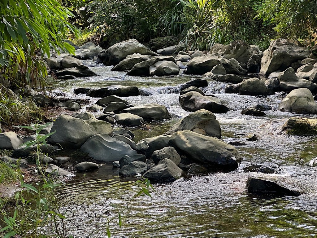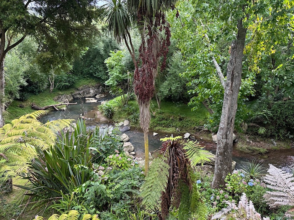 Unser AirBnB liegt eigentlich direkt neben dem State Highway #1, der längsten und wichtigsten Bundesstraße in Neuseeland. Trotzdem bekommen wir vom Verkehr kaum etwas mit, denn die Straße verläuft deutlich oberhalb des Grundstücks, das wir nur über eine Serpentine hinunter ins Flusstal erreichen. Das Flüsschen Waiarohia River strömt von Bäumen überdacht direkt unterhalb der Terrasse unserer Unterkunft laut rauschend durch sein felsiges, gewundenes Bett.