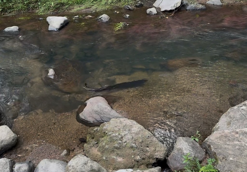 Im klaren Wasser des Flüsschens können wir Neuseeländische Langflossenaale beobachten. Sie können bis zu 180 cm lang und 25 kg schwer werden, den größten hier schätzen wir auf gut über einen Meter. Die Maorí nennen diesen Aal „Tuna“, er ist als Speise geschätzt, hat aber auch mythische und religiöse Bedeutung.