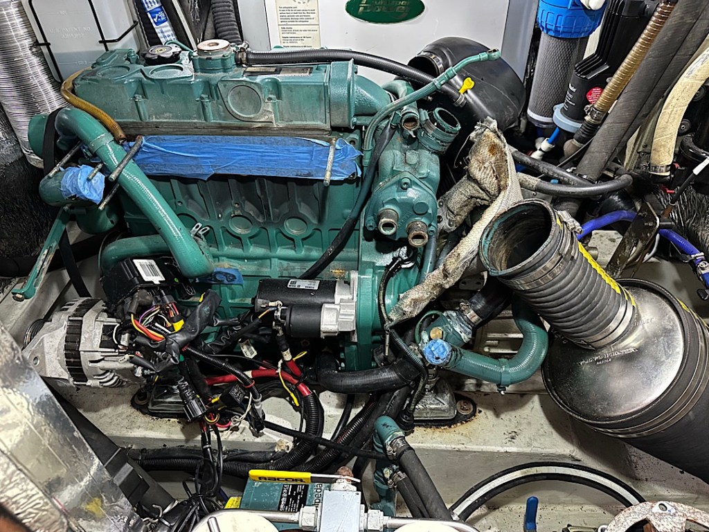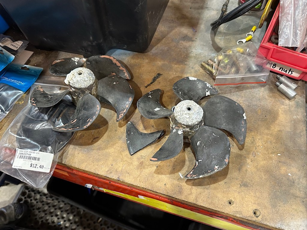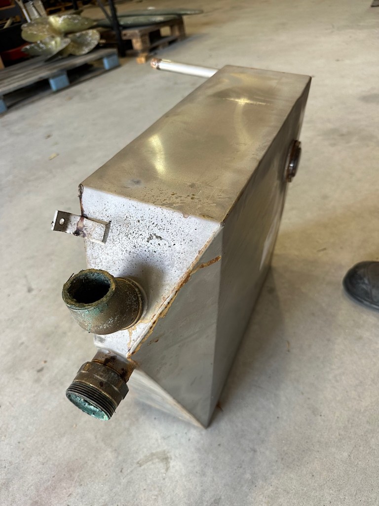 Der Anlasser ist getauscht, der Wärmetauscher ausgebaut (leider hat das Rohrbündel einen Riss), die Motorfüße erneuert, die flexible Wellenkupplung gecheckt (und für noch gut befunden), das Wellenlager erneuert, die Einspritzdüsen geprüft (gut), der Gori-Propeller auseinander genommen und geserviced (war schwierig), der durch nadelkleine Löcher leckende achtere Fäkalientank ausgebaut, ok, dann nehmen wir den vorderen Tank auch noch raus. 9 Seeventile sind bereits (gegen TrueDesign-Komposit-Ventile) getauscht, vier weitere in Arbeit. Mit dem Unterwasserschiff-Coppercoat konnte also noch nicht begonnen werden. Trotz Ansage im November ist das Coppercoat leider auch noch nicht bestellt, da laufen wir jetzt hinterher.