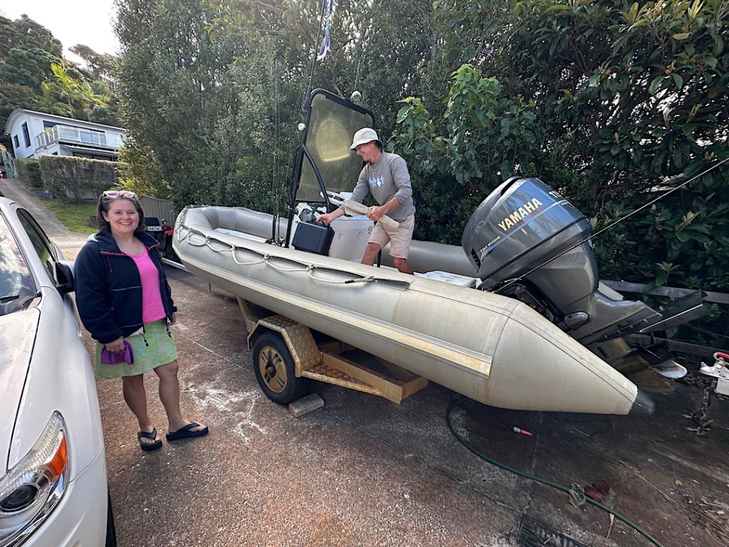 Es wird ein wunderschönes Wochenende. Jacqui und Phil sind leidenschaftliche Wingfoiler und auf der Terrasse direkt am Meer findet sich denn auch eine reichliche Auswahl an Spielzeugen. Der Wind hat allerdings ebenfalls eine Auszeit genommen. Kein Problem, wechseln wir hat auf ein anderes Spielzeug: mit dem Mini-Traktor zieht Phil sein kräftig motorisiertes RIB-Schlauchboot etwa 100 m die Straße hinunter zur Slipbahn.