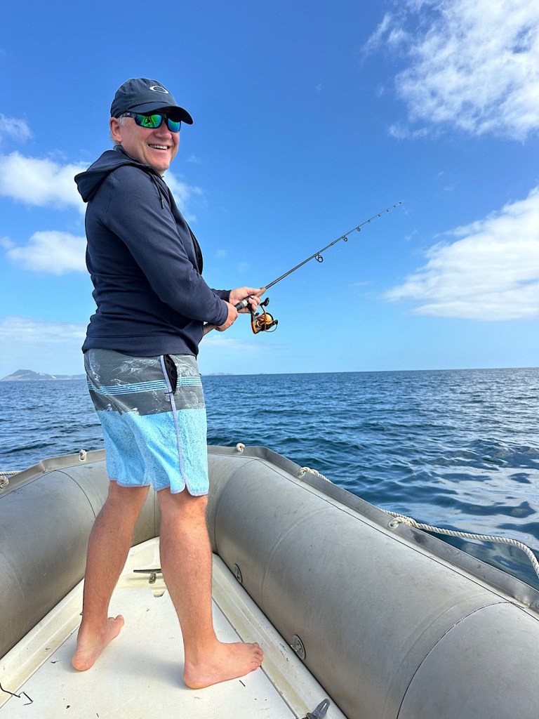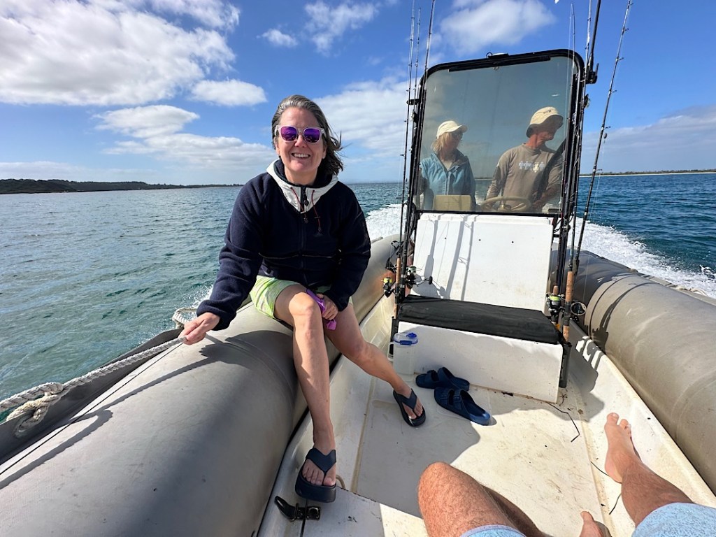 Wiebke und ich fahren im RIB mit. Jacqui bringt Traktor und Trailor zurück, wir holen sie dann auf der Wasserseite ihres Grundstücks ab. Gemeinsam brausen wir über die Bucht und versuchen an verschiedenen Stellen unser Angelglück.