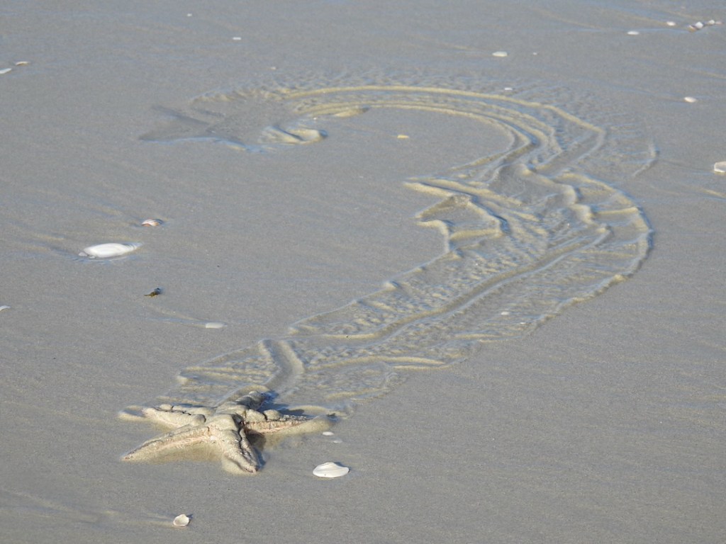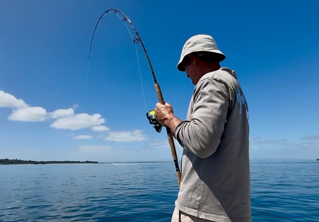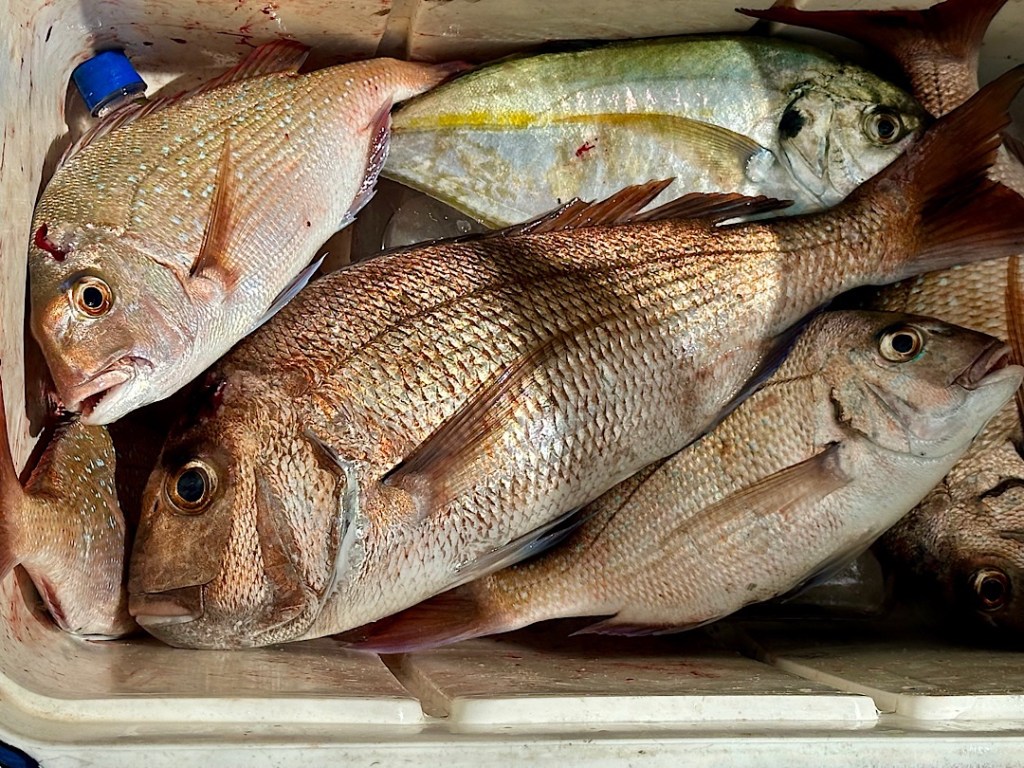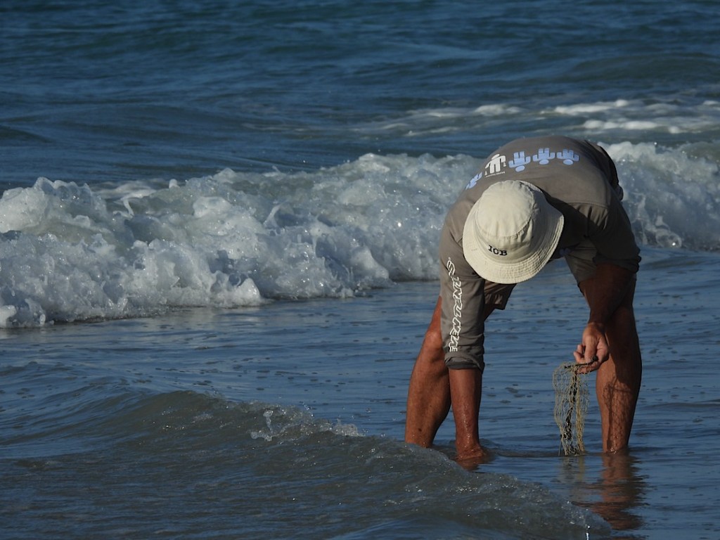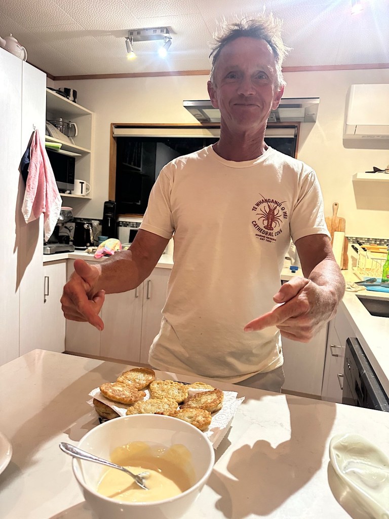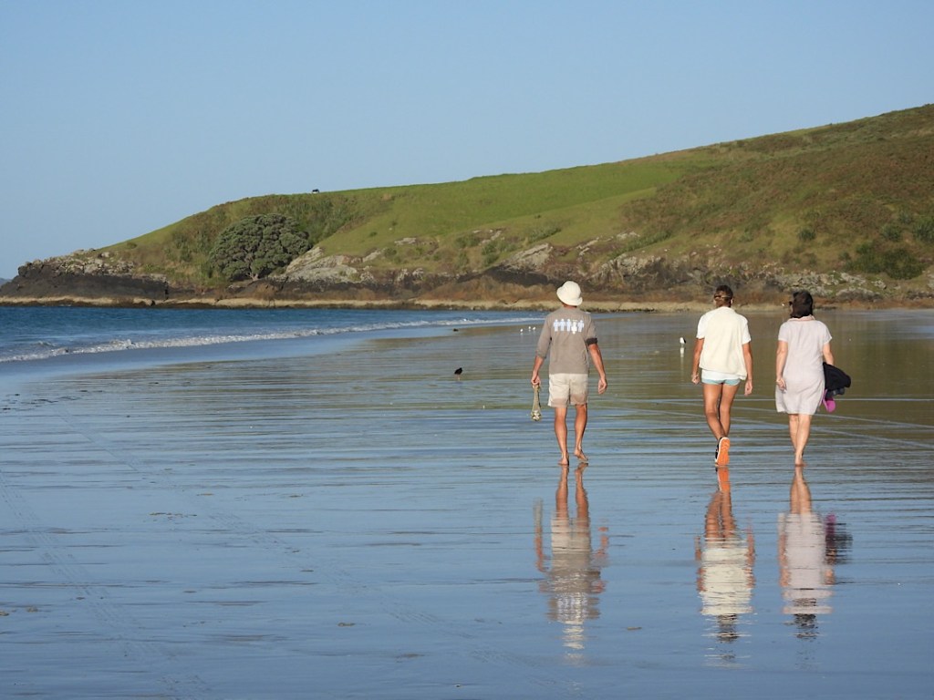 Allerdings: beim ersten Versuch haben wir nur bedingt Erfolg. Einen Pigfish lassen wir zurück ins Wasser und als sich Phils Angel danach dann so richtig biegt, ist es es kolossaler „Bronze Whaler“. Dieser kräftige Hai zieht uns eine ganze Weile kreuz und quer am Riff entlang, bis wir es im flachen Wasser nah an ihn heran schaffen und die Leine kurz abreißen können. Beim zweiten Versuch am nächsten Tag haben Phil und ich deutlich mehr Angelglück. Die gekauften Köderfische sind zwar so weich, dass sie im Wasser aufgetaut praktisch gleich vom Haken fallen, aber wir erwischen mit der Schleppangel einen „Kahawai“ (eine Art Lachsforelle), der sich kleingeschnitten hervorragend als Köder eignet. Damit fangen wir dann in kurzer Zeit 7 Snapper (zwei setzen wir zurück) und einen Trevally (Dickkopf-Stachelmakrele). Das Festessen ist also gesichert, zumal Phil beim Strandspaziergang am 3 km langen Karikari Beach auch noch fleißig „Tuatua“ sammelt. Diese sich im Sand vergrabenden Muscheln sind eine typische neuseeländische Speise, oft werden sie (frikadellenartig) zu Fritters verarbeitet.