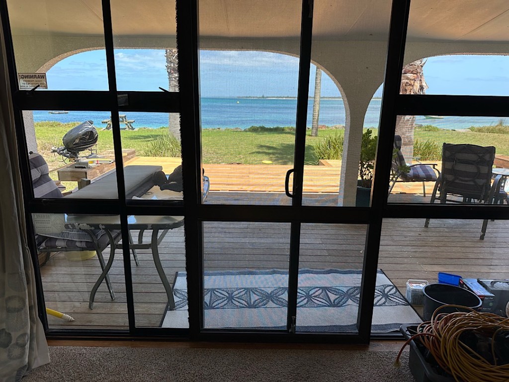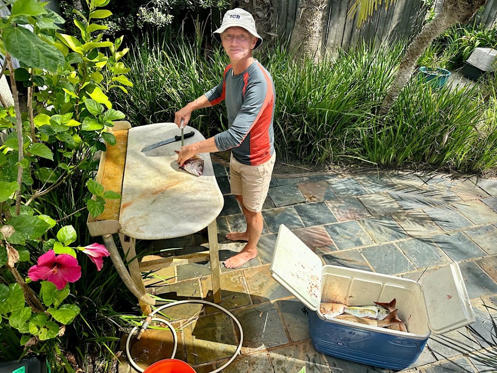 Wir halten die beiden mit unserem Besuch zwar von der Arbeit an der Erneuerung ihrer Terrasse ab, aber die beiden versichern uns, etwas Abwechslung von dieser Arbeit (und der Bootsarbeit auf Skylark) käme ihnen durchaus gelegen.