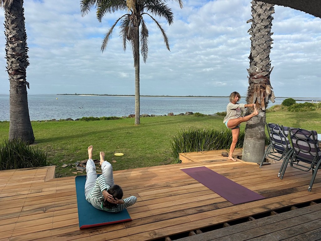 Es geht auch ruhiger: Wiebke und Jacqui nutzen die Terrasse zum morgendlichen Yoga und lassen sich auch von den auf dem Rasen vorbeispazierenden kalifornischen Schopfwachteln (wieder so eine heimisch gewordene importierte Art) nicht irritieren.