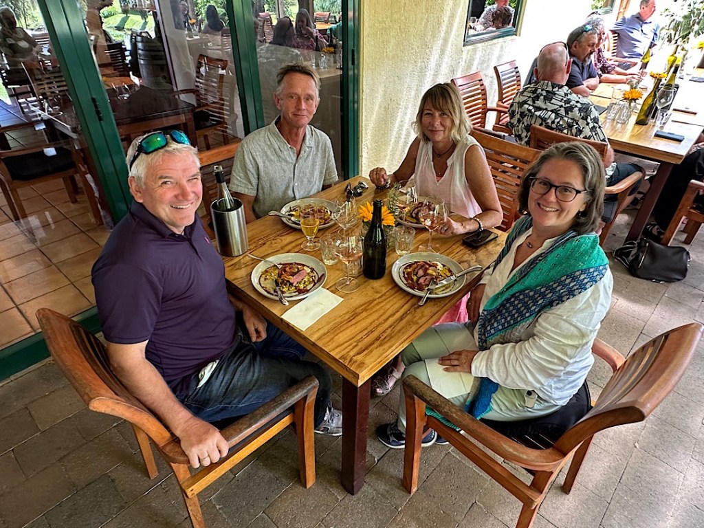 Ein herrliches Wochenende, die Zeit verfliegt. Zum Abschluss begleiten uns Jacqui und Phil noch eine Stunde auf der Rückfahrt Richtung Whangārei. Gemeinsam besuchen wir das Weingut „Marsden Winery“ bei Kerikeri und essen wunderbar im dortigen Restaurant.