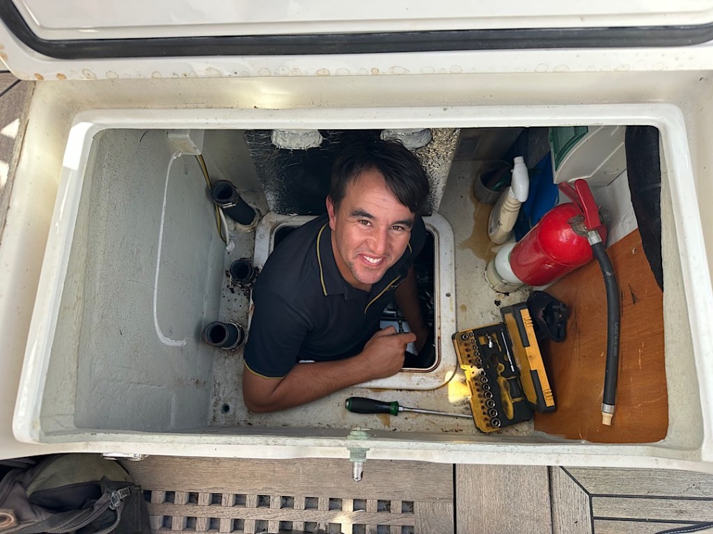 Beim Generator scheint der Wasserabscheider zum Glück doch in Ordnung zu sein, nach seinem Ausbau (er sitzt in der Backskiste) kommen wir außerdem besser an die Rückseite des Generators heran. Mechaniker Byron findet dann allerdings einen übel aussehenden Wärmetauscher am Generator.