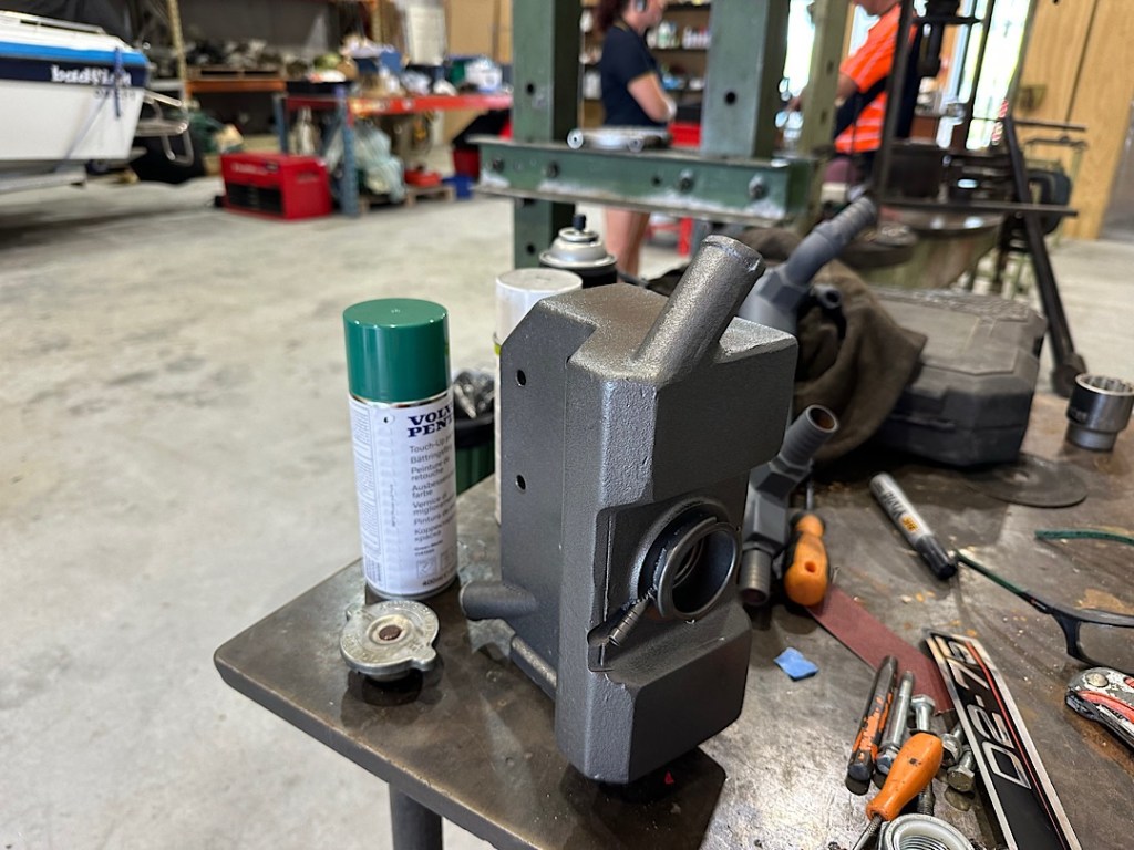 Auch gut: die Teile für den Volvo-Motor (Turbo und Rohrbündel des Wärmetauschers) sind eingetroffen, die gereinigten Motorteile sind bereits grundiert und müssen nur noch lackiert werden, dann kann es an den Wiedereinbau gehen.
