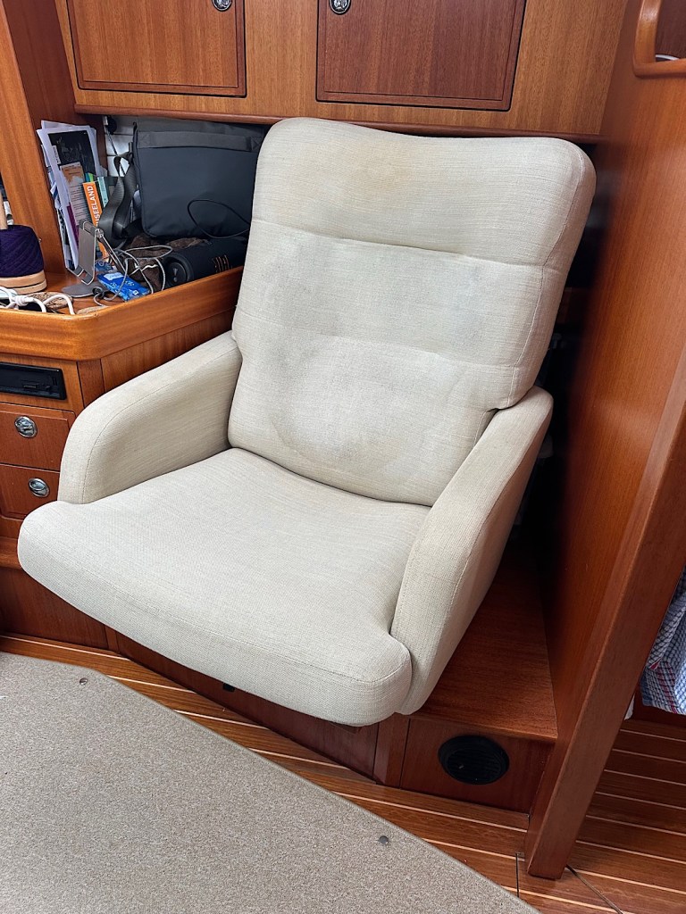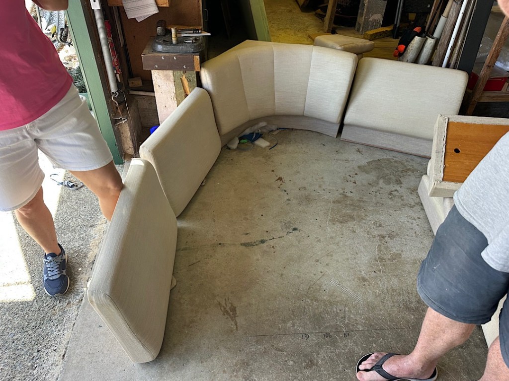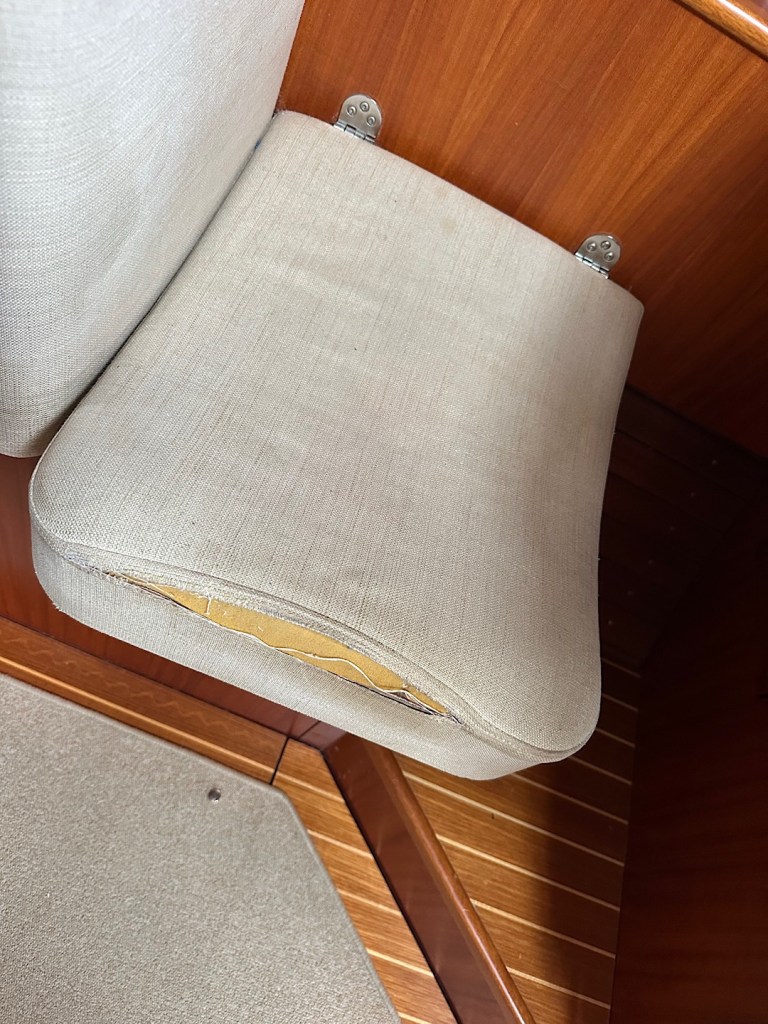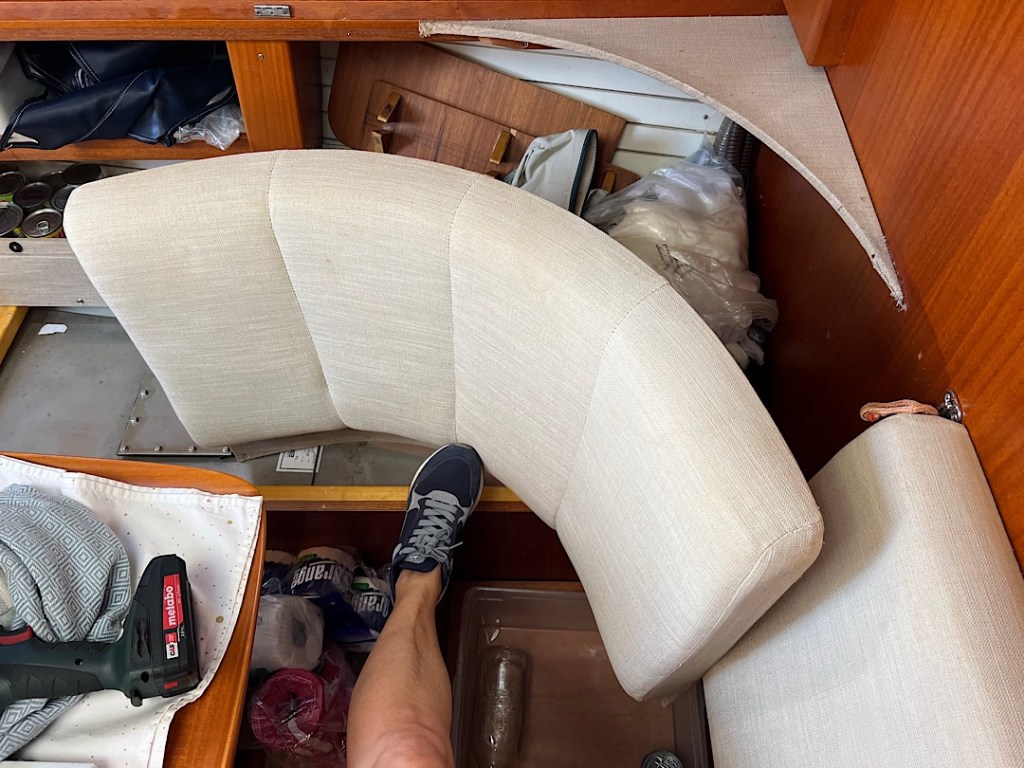 Was noch? Unter anderem bauen wir alle Polster aus dem Salon (also Sofaecke, Sessel, Navisitz) und den Sitz in der Achterkoje aus und geben sie zum Polsterer. Am schlimmsten präsentiert sich der Sitz am Navitisch, aber auch die Flecken und Scheuerstellen an den anderen Polstern haben wir zuletzt immer mit Überwürfen kaschiert. Das muss jetzt mal neu. Außerdem wollen wir die „runde Ecke“ des Sofas umarbeiten zu einer eckigen. Deutlich gemütlicher zum Liegen und auch zum Lömern mit hochgezogenen Beinen. Zudem wird das Staufach hinter der Rückenlehne besser zugänglich. Das Herausnehmen ist bei den meisten Polsterteilen recht einfach, nur einige verdeckt durch den Polsterstoff angeschraubten Rückenlehnen machen die Aktion doch etwas langwieriger.