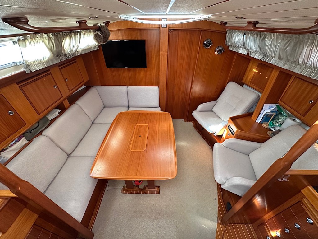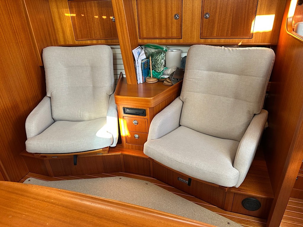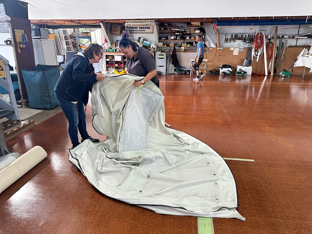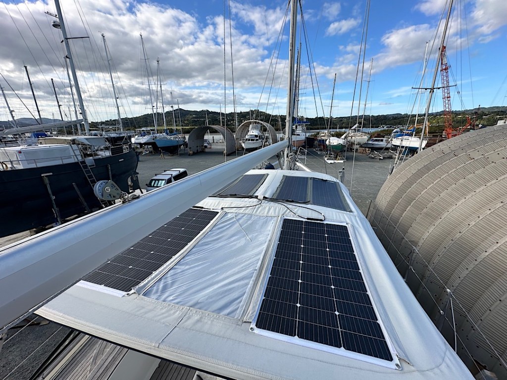 Außerdem ist unser Bimini repariert. Der Stoff wurde geflickt und verstärkt, die spröde und rissig gewordene Fensterfolie erneuert, die Klettabdeckungen der Reisverschlüsse nachgenäht bzw. getauscht. Dadurch können wir auch die jetzt die 400 WP Solarpanel auf dem Bimini wieder nutzen, um so wichtiger, weil ja jetzt die anderen 400 WP auf den Davits gerade abgebaut sind.
