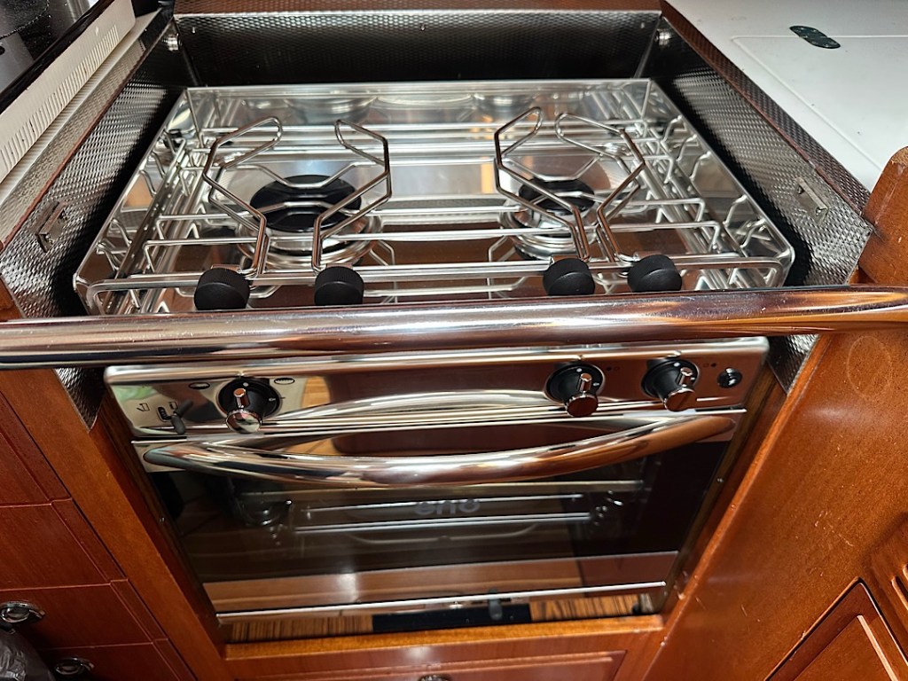 Den alten Herd, der uns auf dem Törn nach Neuseeland aus der Halterung gesprungen war und dessen gebrochene Aufhängung wir notdürftig repariert hatten, wird durch eine neuere Version ersetzt. Damit haben wir endlich auch die Möglichkeit zusätzlicher Oberhitze im Backofen.
