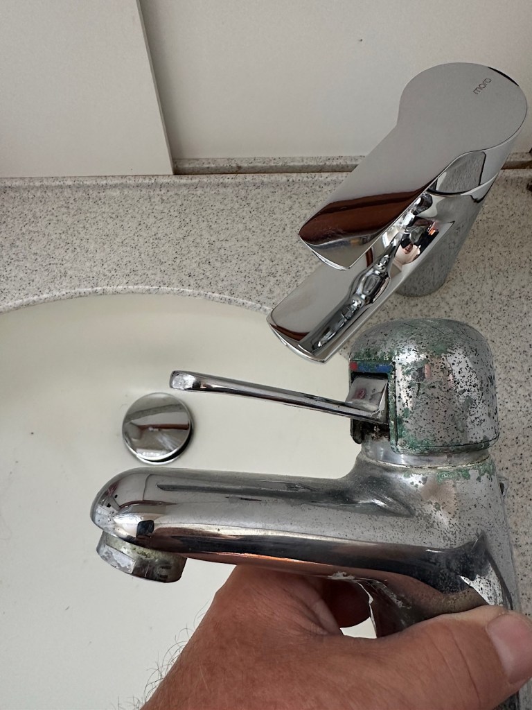 Dazu diverser Kleinkram. Ein Beispiel: die Wasserhähne im Bad sind ziemlich unansehnlich geworden, das lässt sich leider auch nicht mehr wegpolieren. Ich hatte neue bestellt, leider sind aber die nötigen Anschlussfittinge trotz Odyssee durch alle in Frage kommenden Geschäfte nicht zu bekommen. Wohl oder übel muss ich die alten Anschlussfittinge aufarbeiten und wiederverwenden.