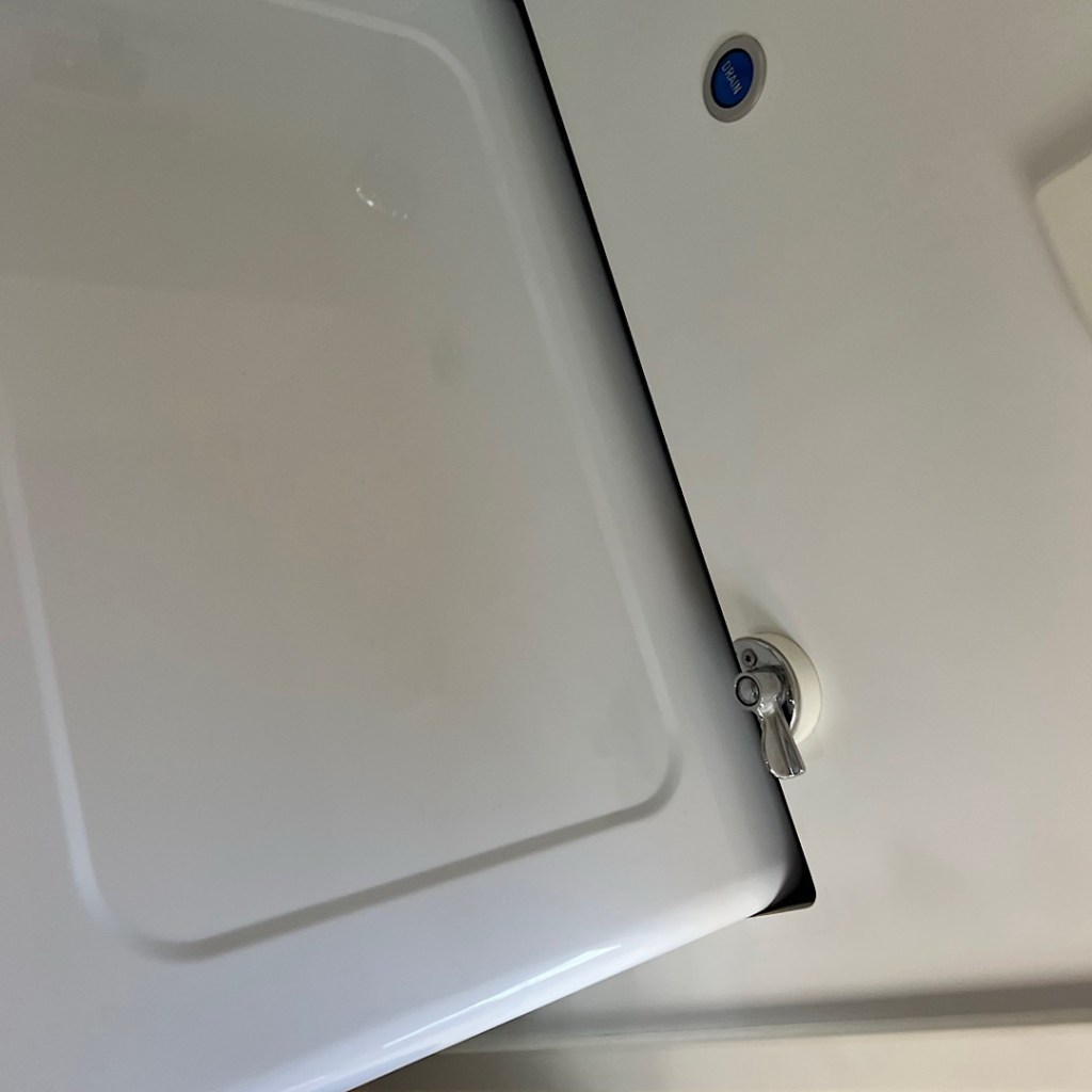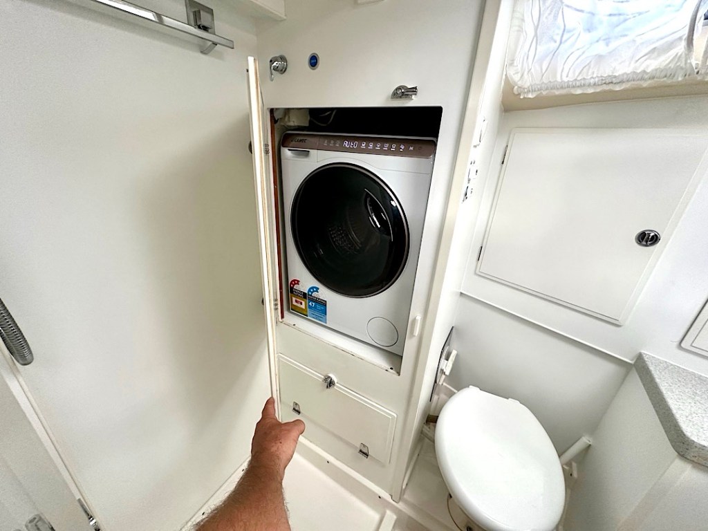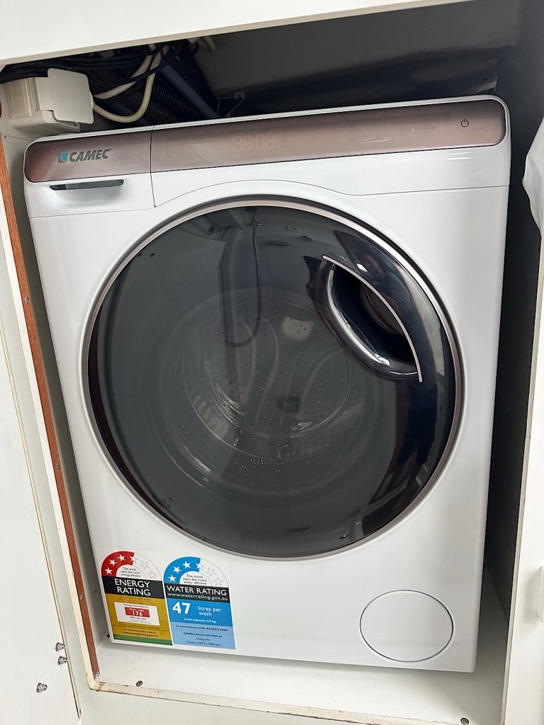 Aber im RV Super Centre gibt’s auch einen Zubehörshop und der bietet eine Waschmaschine an, die unserer schon seit Panama irreparabel kaputten Candy 3,5 kg recht nahe kommt. Die Camec RV II 4 kg ist – wie könnte es anders sein – minimal zu groß. Limitierend sind auf der Flora die Tür zum vorderen Bad mit 47 cm Breite, zudem ist das Loch für den Einbauort der Waschmaschine (von der Dusche aus) nur 51,5 cm breit und 75 cm hoch.