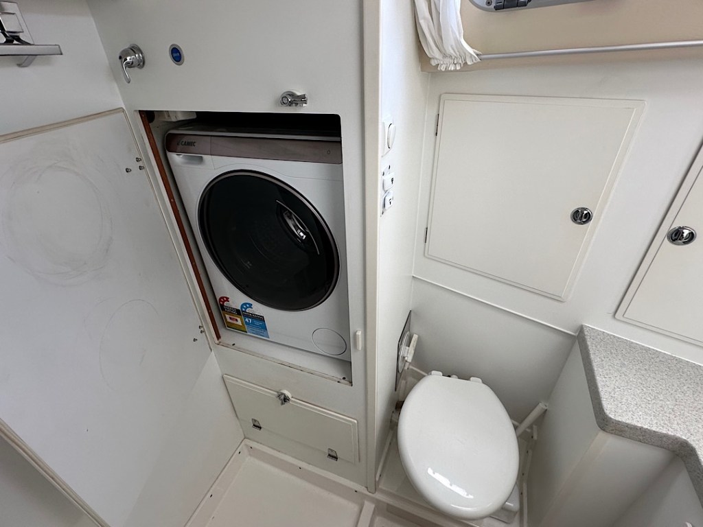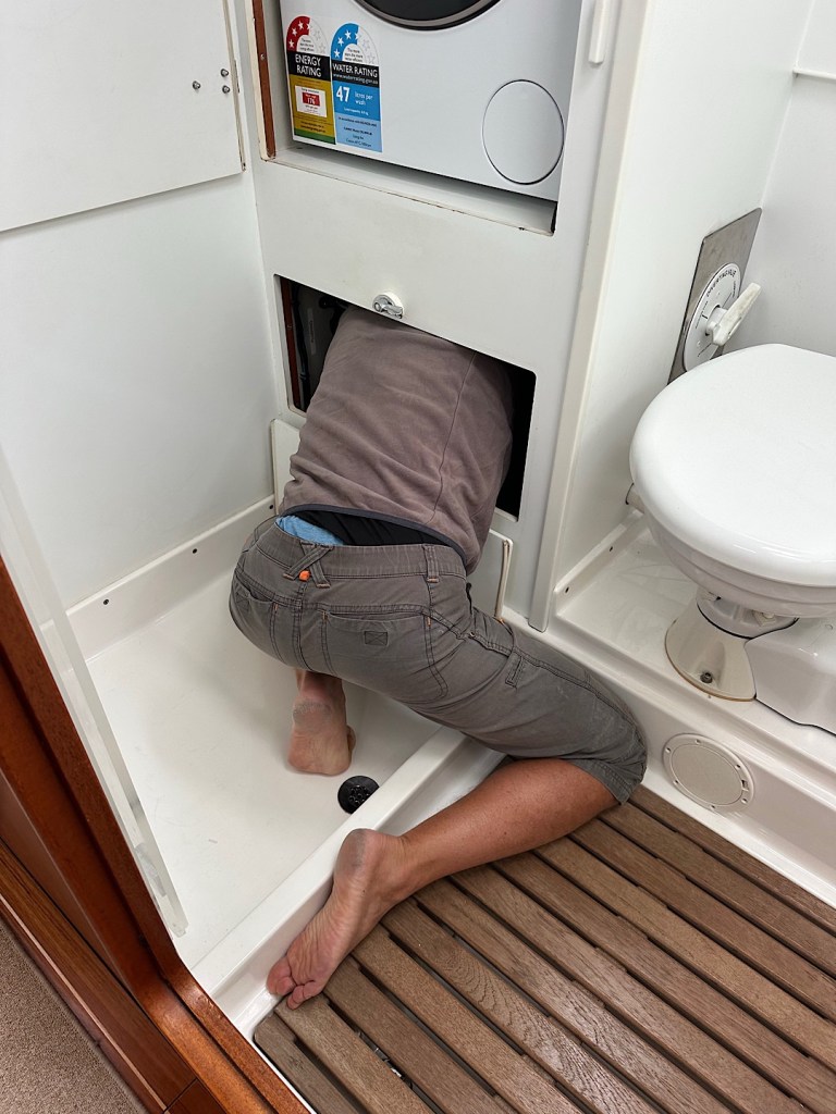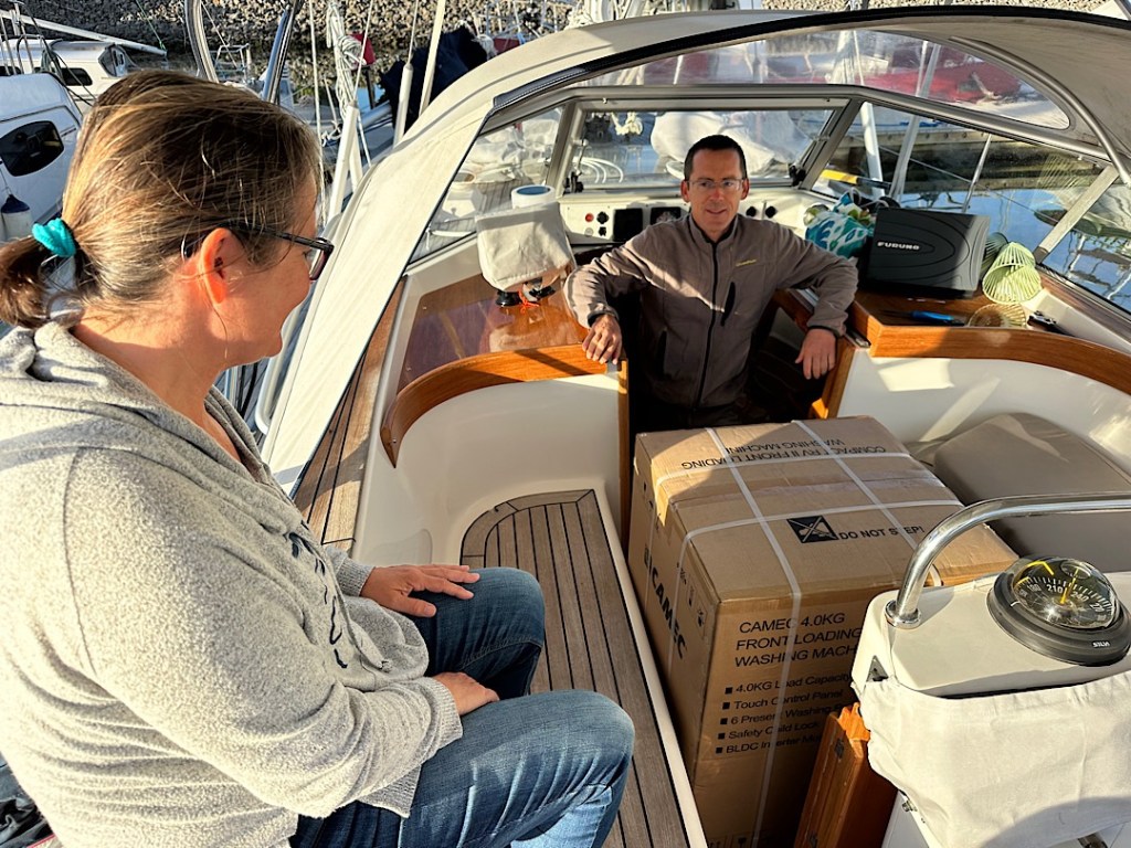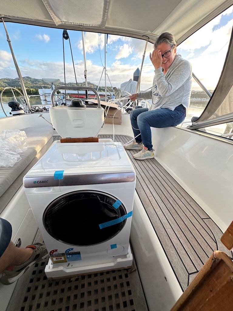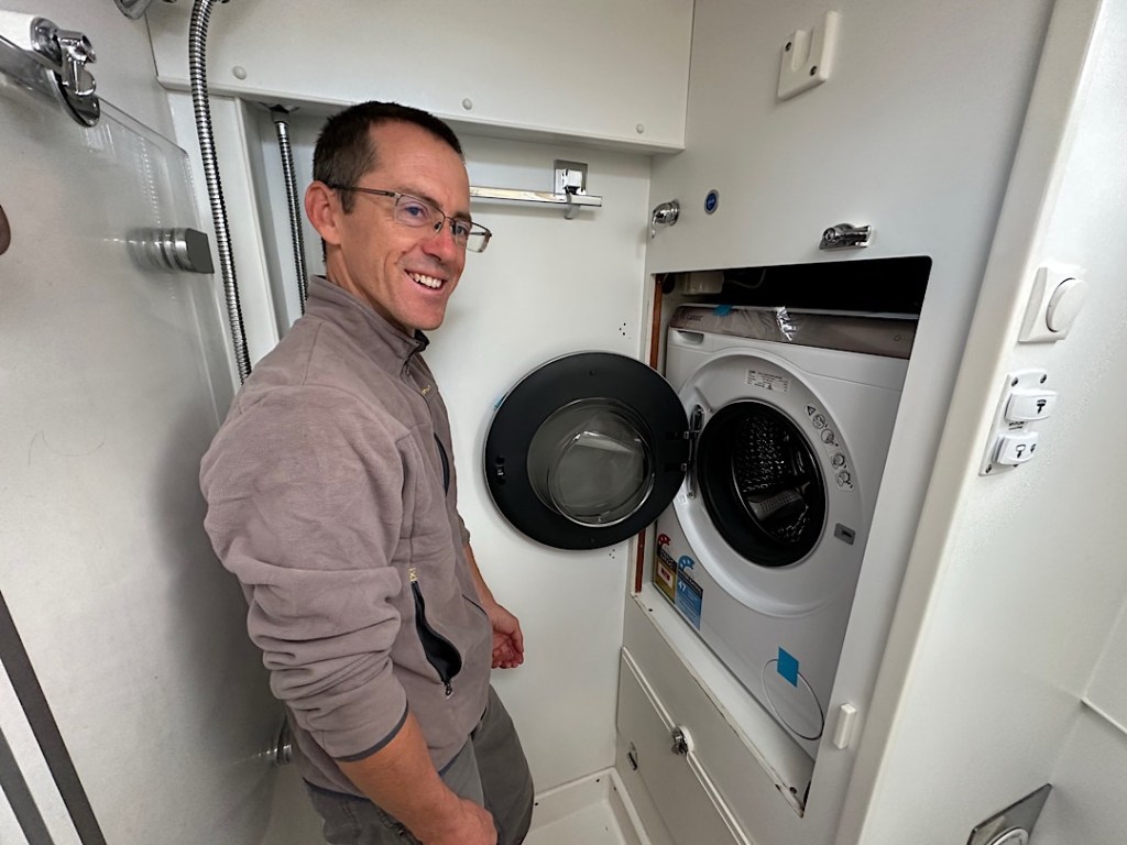 Ben von der „Kujira“ kommt uns zu Hilfe. Kräftig und super schlank, das wird helfen. Und tatsächlich, wir wuchten die Maschine über die Reling und ins Cockpit, entfernen die schützende Verpackung. Dann die Treppe herunter in den Salon. Tür der Waschmaschine abschrauben. Es klappt, wir kommen durch die Türdurchlässe gerade so eben durch. Wir verbinden den Wasserzulauf, binden das Stromkabel und de Abwasserschlauch an die zuvor gezogenen Pilotleinen und zirkeln mit etwas Mühe die 45 Kilogramm der Camec durch die enge Öffnung, wobei sich Ben tatsächlich noch zwischen Duschwand und Maschine quetschen kann. Drin, passt wie angegossen. Waschmaschinentür wieder dran, mit Spanngurt herunterzurren, anschließen, fertig.
