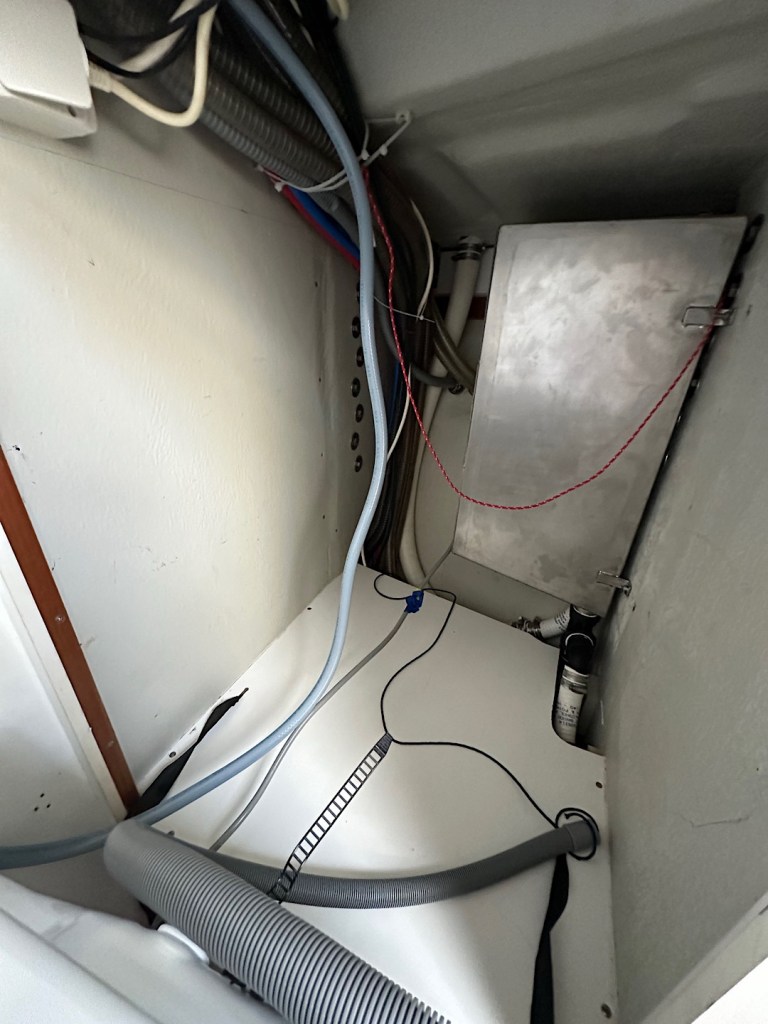 (Kar-)Freitag: wir bereiten das Projekt Waschmaschine weiter vor. Ich verlege die Schläuche im Waschmaschinen-Kabbuff etwas anders, um oben mehr Platz zu schaffen. Messe alles noch einmal aus, zeichne an den Wänden mit Bleistift Markierungen an. Baue die Tür zum Waschmaschinenkabuff und die große Tür vom Salon zum Vorschiff aus. Schraube den Salontisch ab und schiebe ihn ganz zum Sofa. Soviel Platz schaffen wie möglich. Auch das Steuerrad im Cockpit wird ausgebaut.