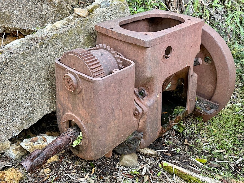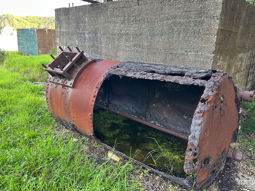 Drumherum fast nur Natur, lediglich ein paar unauffällige Ruinen einer alten Walfangstation am Ufer. Das müssen wir uns natürlich ansehen. Ein Hinweisschild erläutert, dass früher Wale in die innere Bucht getrieben wurden, die dann mit einem Netzt abgesperrt wurde. Bis zu 10 Wale im Jahr konnten dann mit Harpunen erlegt werden. In der Walfangstation wurde der Walspeck dann zu Öl verarbeitet. In späteren Jahren (Anfang des 20. Jahrhunderts) gab es dann ein dampfbetriebenes Harpunierschiff, mit dem außerhalb der Bucht gejagt wurde. Bis zu 50 Wale im Jahr wurden damit erlegt und ebenfalls zur Weiterverarbeitung in die Bucht gebracht. Ein paar rostige Maschinenteile, die aus Beton gegossenen Kochstellen und ein von der Natur schon fast zurückerobertes ehemaliges Maschinenhaus sind noch zu sehen.