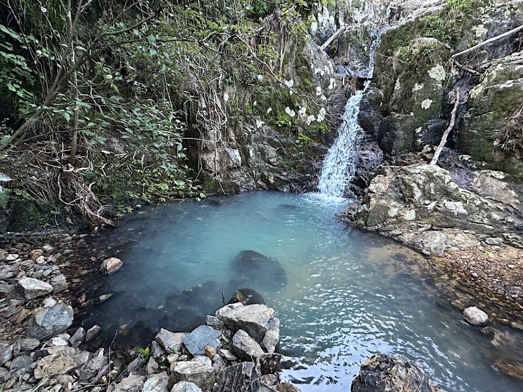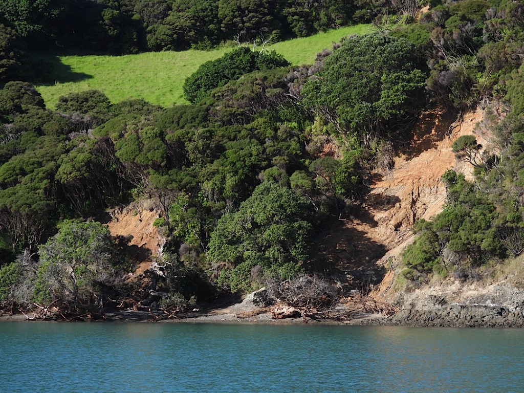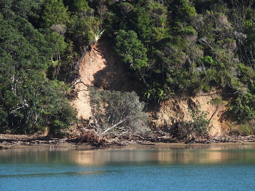 Wir wandern noch ein kleines Stückchen weiter zu einem Wasserfall mit Dusch- und Badebecken. In die andere Richtung verläuft ebenfalls ein schmaler Wanderpfad, der aber nach 100 Metern schon wieder endet (für uns, abgesperrt ist es nicht). Nur noch fußbreit läuft er am steilen Hang entlang weiter, den Rest hat offenbar kürzlich ein Erdrutsch mitgenommen. Auch die übrigen Hänge um die Bucht herum weisen vielfach die Narben frischer Erdrutsche auf. Ob das Vaianu war oder schon die starken Regenfälle davor?
