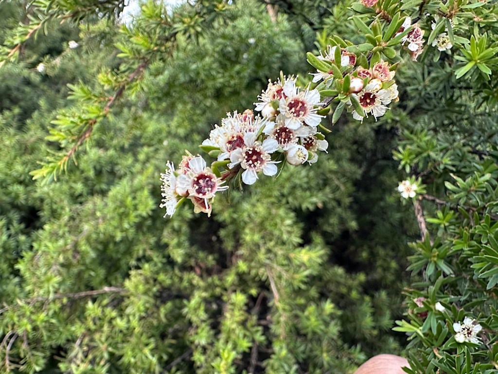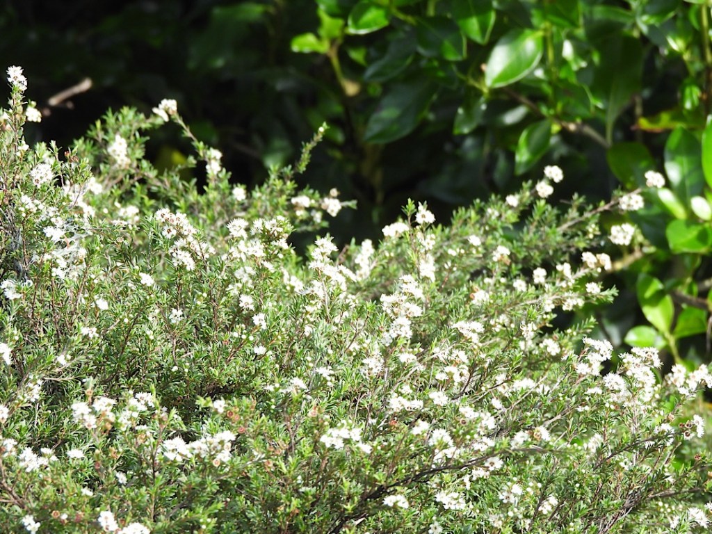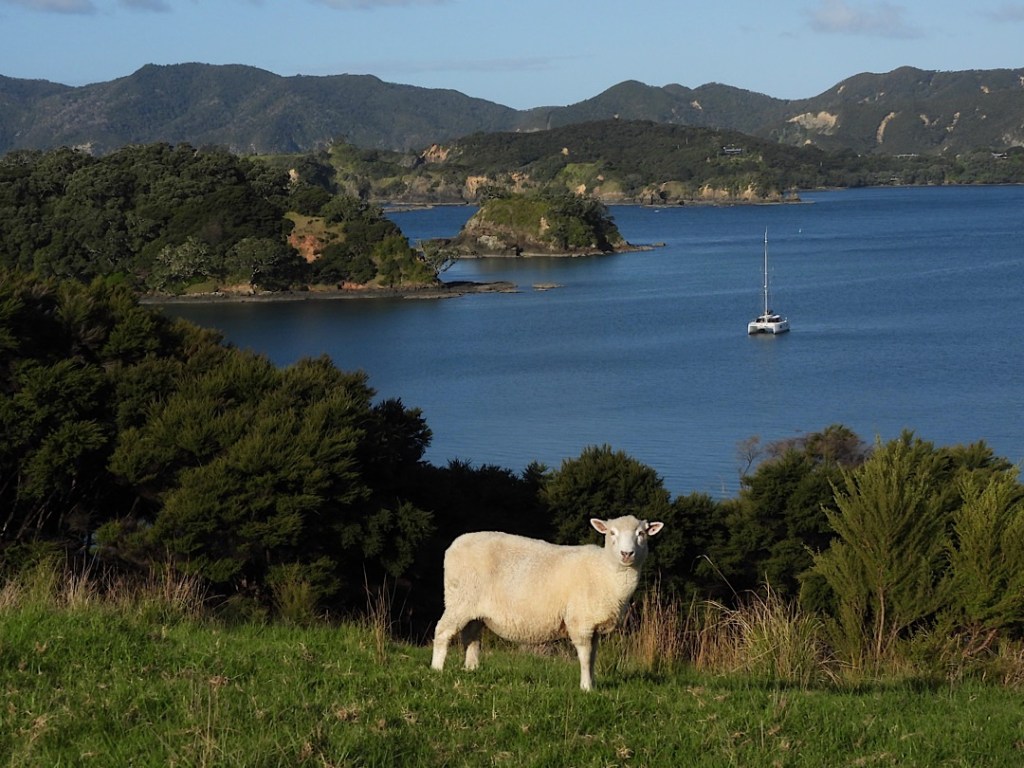 Noch am Abend machen wir einen ersten kleinen Hike auf der Insel, am nächsten Morgen gleich einen zweiten, deutlich längeren. Die Wanderpfade auf Urupukapuka sind gut markiert. Sie führen kreuz und quer über das etwa drei Quadratkilometer große Eiland, manchmal unmittelbar an den Abgründen der steilen Klippen entlang, hinab zum Strand einer Bucht und wieder hinauf auf die Klippen. Mal über Schafweiden, dann wieder durch dichte niedrige Wälder aus Südseemyrthe. Das etwas weichere Manuka und das härtere Kanuka werden auch Teebaum genannt. Aus dem Nektar machen die Bienen den berühmten Hanuka-Honig. Wir sind erstaunt, das diese Bäume jetzt im Herbst noch Blüten tragen.