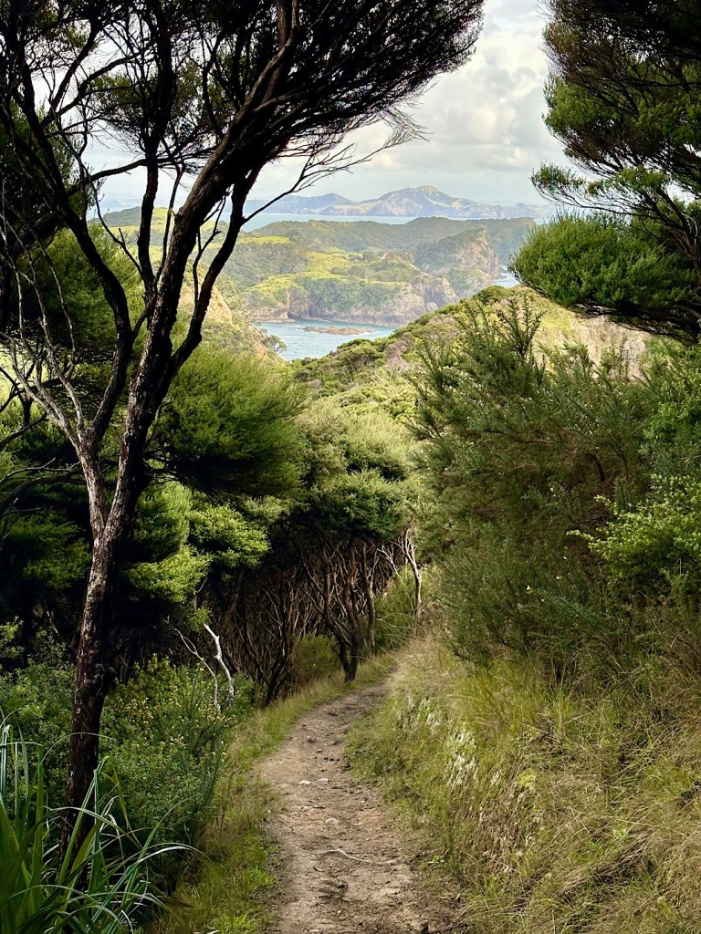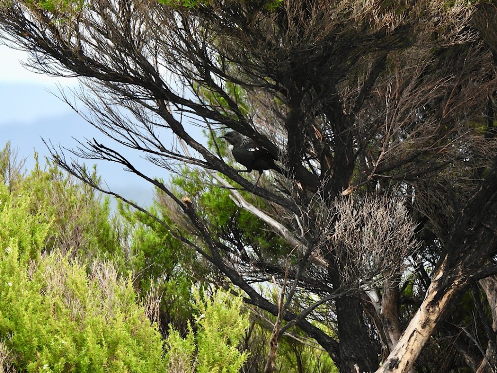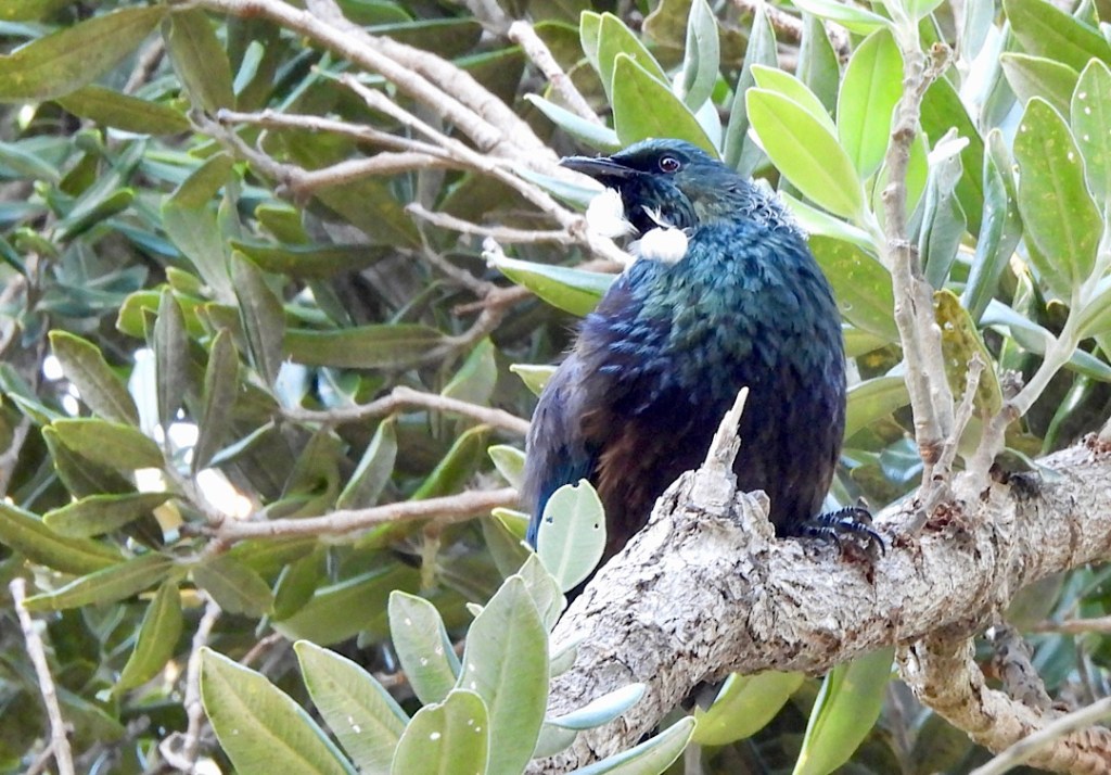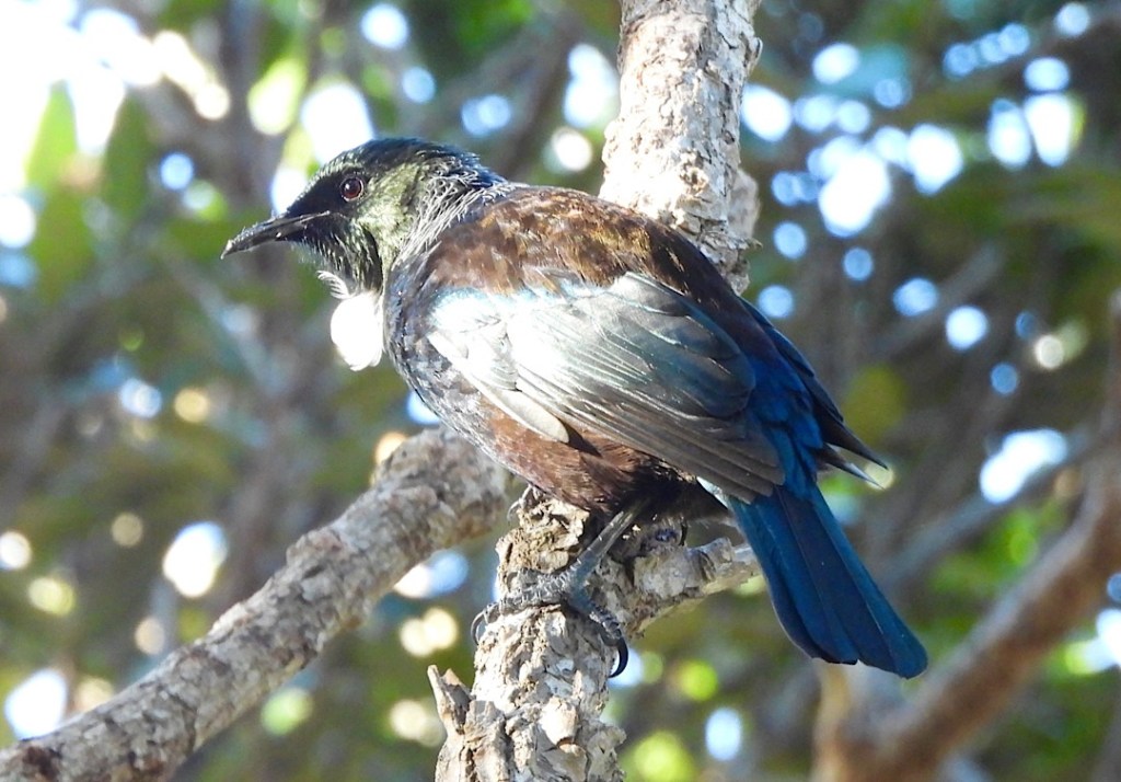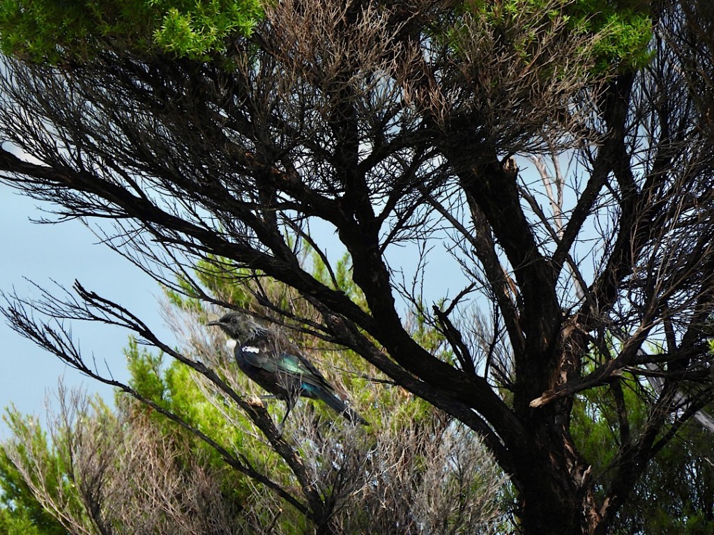 Was aber fast noch beeindruckender ist und diesen Hike ganz besonders macht: Urupukapuka ist – wie einige andere Inseln in der BOI – seit 2008 offiziell „mammal pest free island“. Alle vom Menschen eingeführten für die heimische Tierwelt schädlichen Säugetiere (wie Mäuse und Ratten, aber auch Katzen und Hunde) gibt es auf Urupukapuka nicht mehr. Die heimische Tierwelt kann sich hier wieder erholen und wurde zum Teil auch extra wieder angesiedelt. Kiwi-Vögel sehen wir zwar nicht (Kunststück, wir sind ja tagsüber unterwegs). Was aber deutlich auffällt, ist der fast überall präsente melodische Gesang der Tui. Das hatten wir bisher so noch nirgends in Neuseeland. Es braucht ein bisschen, ehe wir die eher scheuen Vögel auch entdecken. In der Ferne sieht man sie manchmal auf einem erhöhten Zweig, bei Annäherung verstecken sie sich aber gerne im dichten Geäst der Manuka oder anderer Bäume. In deren Schatten fallen ihr dunkles Gefieder und die weißen Federpuschel am Halsansatz dann kaum auf. Im Sonnenlicht dagegen entfaltet das Federkleid seine eigentliche Pracht.