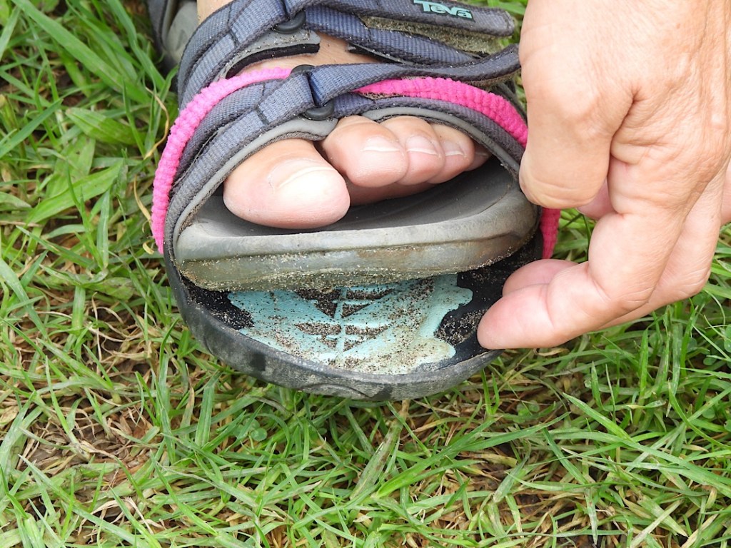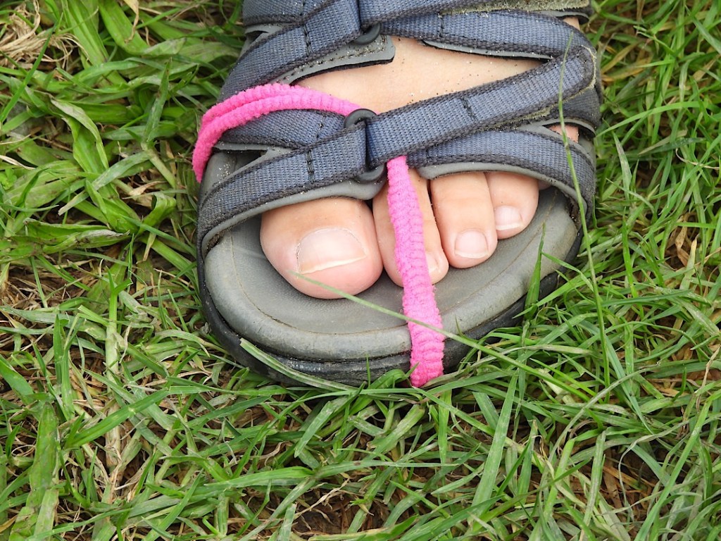 Ganz verlustfrei geht der Hike nicht ab. An Wiebkes linker Sandale löst sich die Sohle. Barfuß weiter? Aber nein, Notreparaturen sind wir ja gewohnt: ein Haarband wird geopfert und für den Rest des Hikes hält das ganz tatsächlich auch.