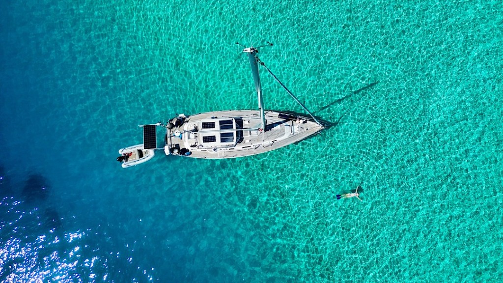 Insgesamt haben wir theoretisch 830 Wattpeak an Solar, davon 430 durch das große Panel auf den Davits an Floras Heck.