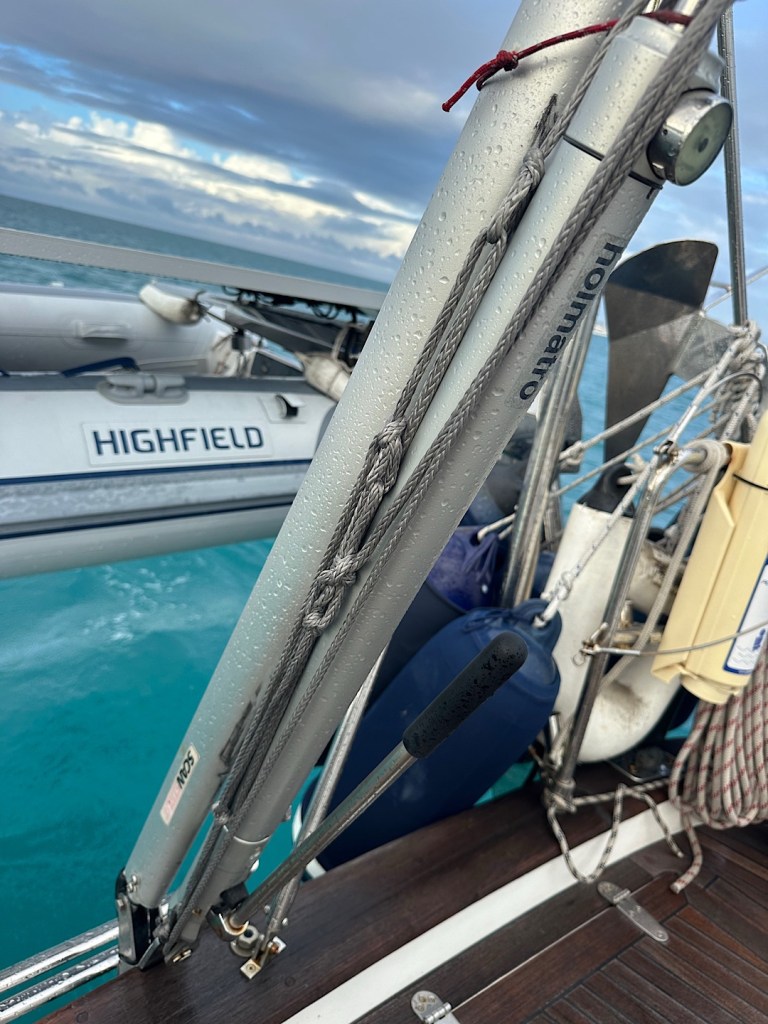 Weitere 400 Wattpeak könnten die Solarpanel auf dem Bimini liefern. Die jetzt wieder einsatzfähigen SunWare-Module steuern ja seit Jahren zuverlässig 200 Wattpeak bei. Die semiflexiblen sind zwar nicht ganz so effektiv wie das feste Panel auf den Davits, aber immerhin. Ein ziemlicher Reinfall dagegen sind die (deutlich billigeren) SunBeam-Panel. Für diese hatten wir erst letzten Oktober in Tahiti von einem Segelmacher eine Befestigung mit Reißverschüssen und Klett auf dem Bimini machen lassen. Aber schon jetzt liefert eines der Panel gar keine Leistung mehr, zudem werden beide Panel an der Oberfläche so matt, dass auch die Leistung des zweiten Panels jedenfalls beeinträchtigt ist.