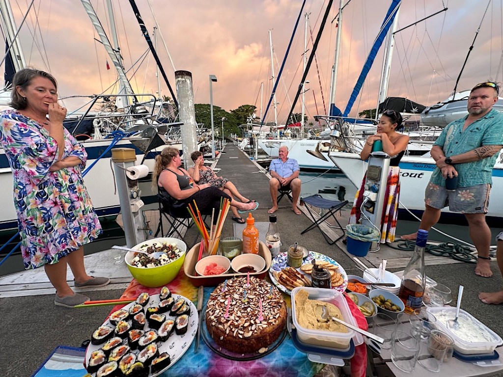 Auch das läuft extrem entspannt ab, die ordentliche Vorbereitung findet er offenbar gut. Kein Durchstöbern aller Schapps, kein Anheben der Bodenbretter, nicht mal ein Blick in den Kühlschrank. Zudem wandert weit weniger als befürchtet in den Biosecurity-Abfallsack zur (kostenlosen) Entsorgung, die Gewürze z.B dürfen praktisch alle an Bord bleiben. Bei Dosen wird nur eine Linsensuppe mit Chorizo konfisziert. Und der Popcornmais muss auch weg.