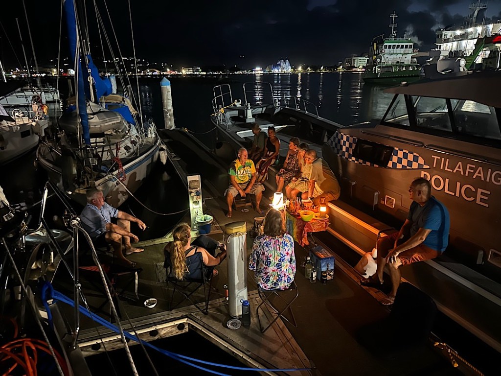 Tatsächlich kommt das MPI zuerst: ein Officer mit an einem Gestänge montierter GoPro und Unterwasserlampe kommt durch das Quarantänetor und direkt zu unserem Boot (insgesamt 11 Boote haben sich hier im Laufe der Nacht eingefunden). Er drückt uns die Masters Declaration in die Hand, aber die haben wir ja schon. Dann verschwindet er nochmal kurz. Inzwischen trifft auch der Zöllner ein. Ich beantworte Cockpit seine Fragen, Wiebke zeigt derweil dem MPI-Officer die (ja vorab elektronisch übermittelten, aber für ein Pre-Approval als nicht ausreichen klassifizierten) Unterwasserfotos auf dem iPad. Das genügt ihm, er hält nicht einmal mehr die GoPro ins Wasser. Kein Emergency-Haul-Out nötig, das sieht doch sehr gut aus. Da fällt uns schon mal ein Stein vom Herzen.