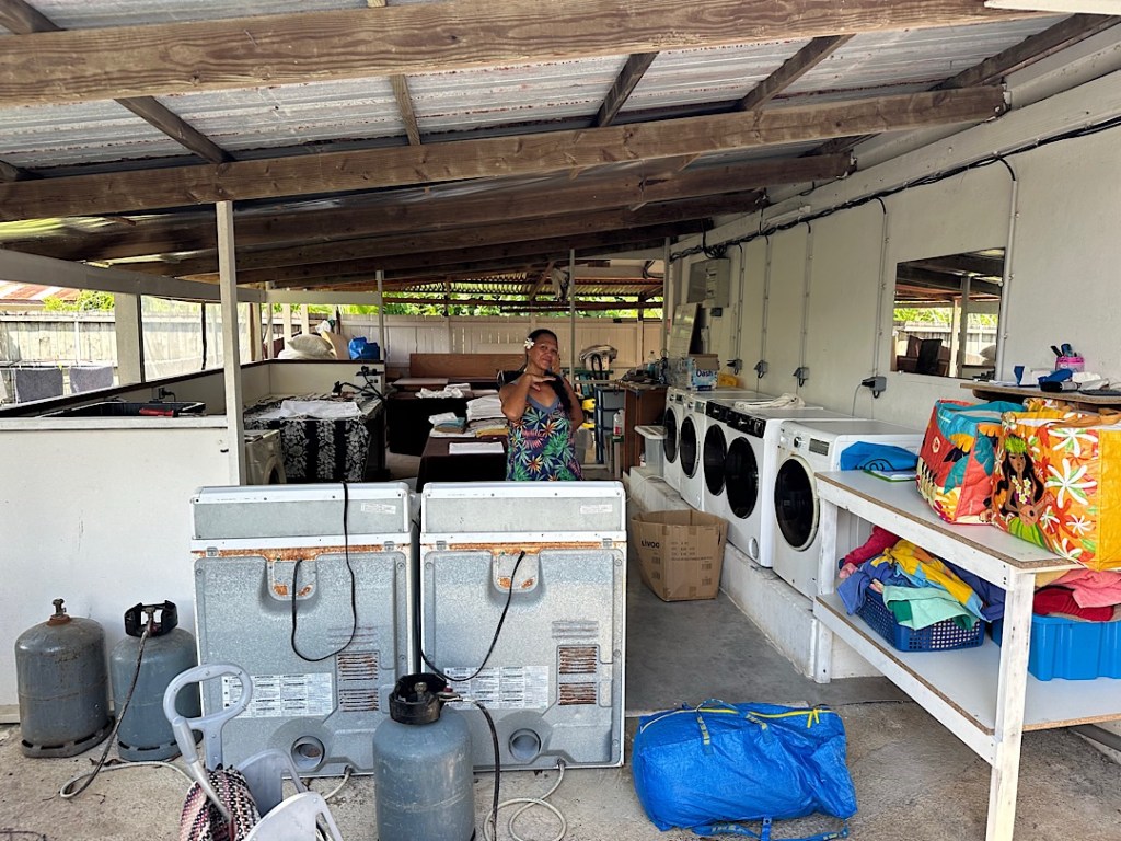 Mit polynesischen Charme auf einer überdachten Terrasse eingerichtet, können wir hier unsere Bordwäsche vormittags abgeben und nachmittags gewaschen, getrocknet und gefaltet wieder abholen. Kein ganz billiger Service, für die zu 3/4 gefüllte Ikea-Tasche Wäsche sind umgerechnet etwa 36 Euro fällig.