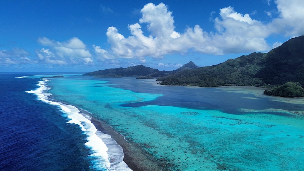 Die Baie Hotopuu ist wunderschön, das Ufer von Palmen gesäumt, hinter denen sich – wie in den Gesellschaftsinseln typisch – spitz gezackte Berge gen Himmel strecken. An der Nordseite der Bucht gibt es einen steilen Felsabbruch. Es wirkt, als schaue jemand aus dem Berg auf die Bucht herunter und weiter durch den Pass Teavamoa hinaus in die Ferne des Ozeans.