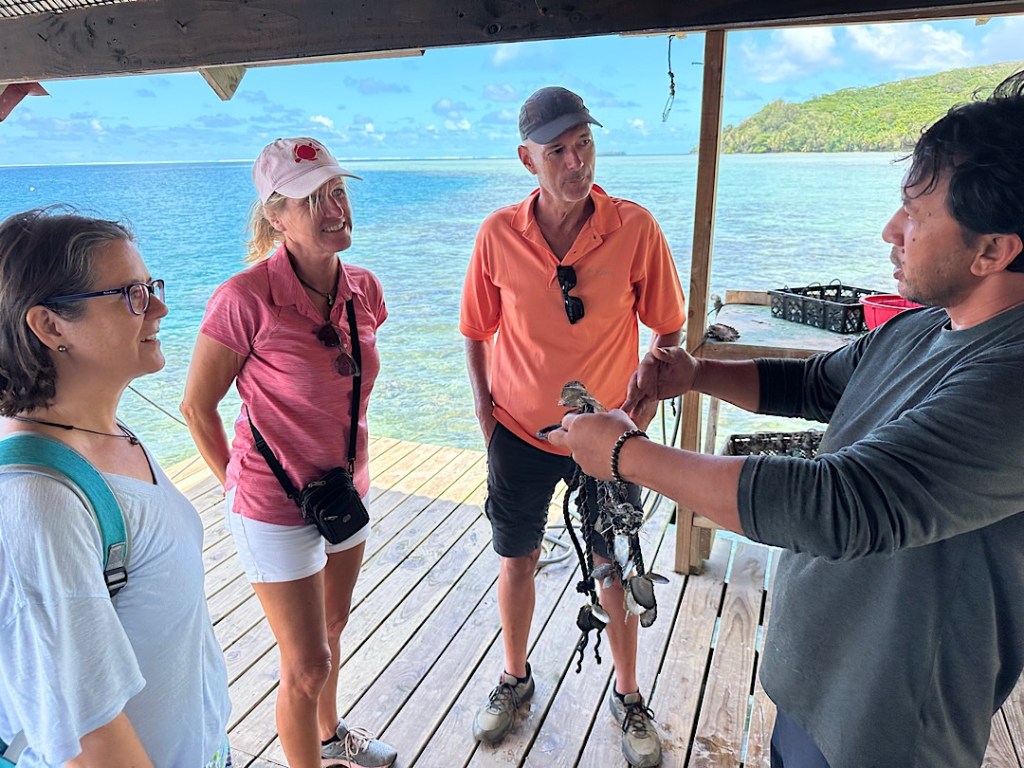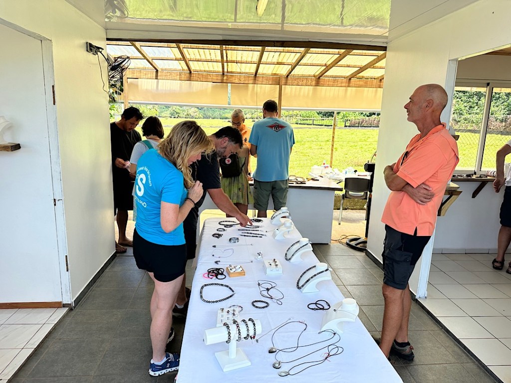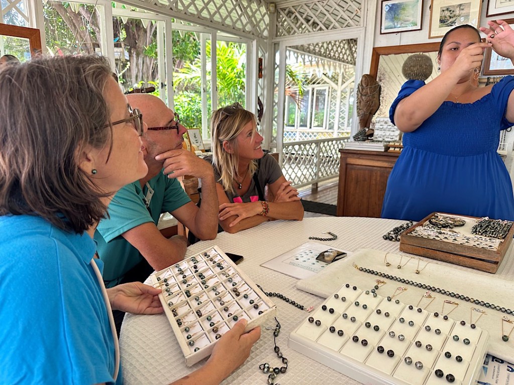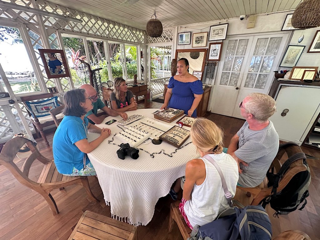 Beide nehmen sich Zeit für uns und beantworten geduldig unsere Fragen. Nur auf unsere Nachfrage hin bringt uns Landry dann auch an Land zum kleinen Schmuckgeschäft der Perlfarm.