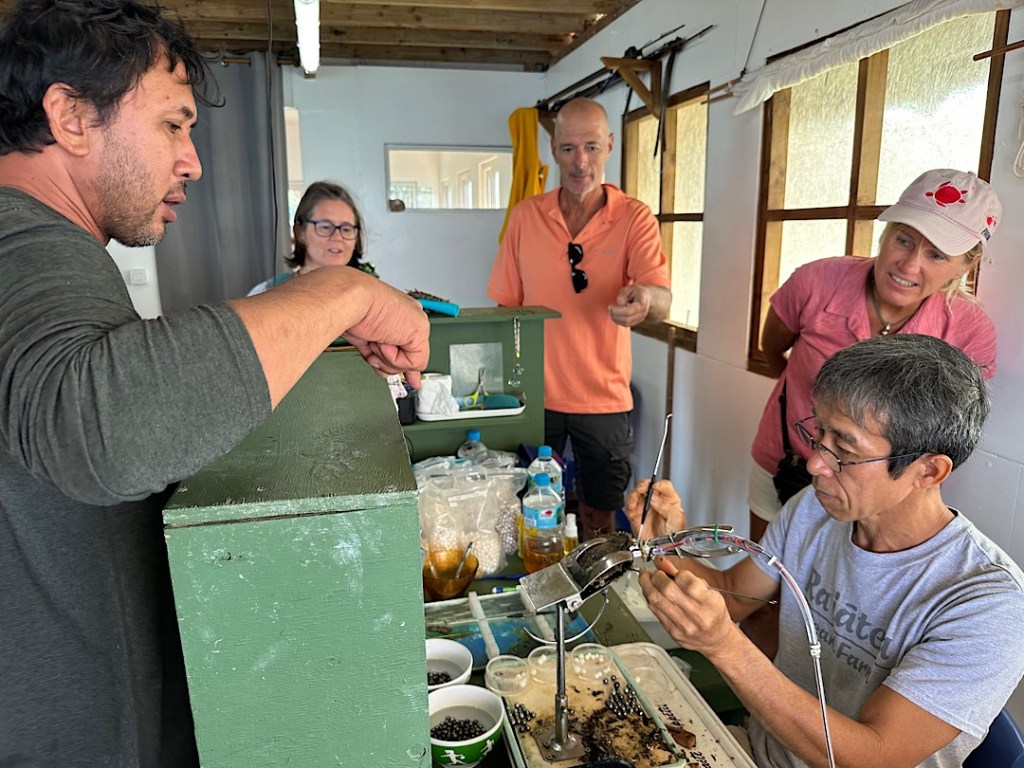 Landry erklärt uns die Abläufe auf der Farm. Etwas überraschend ist, das hier in Raiatea nicht ausreichend Larven für Perl-Austern für eine eigene Zucht vorhanden sind. Die Perlfarmen hier beziehen deshalb junge “Baby-Muscheln” von den Tuamotus. Sie ziehen diese dann weiter auf, bis sie groß genug sind für die eigentliche Perlen-Produktion.