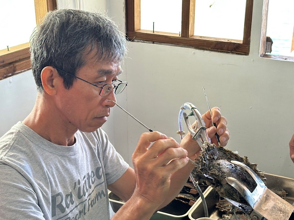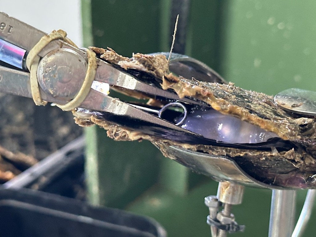 Das Entnehmen der Perlen und das Einsetzen eines neuen Nukleus zeigt uns dann Landry’s japanischer Mitarbeiter: