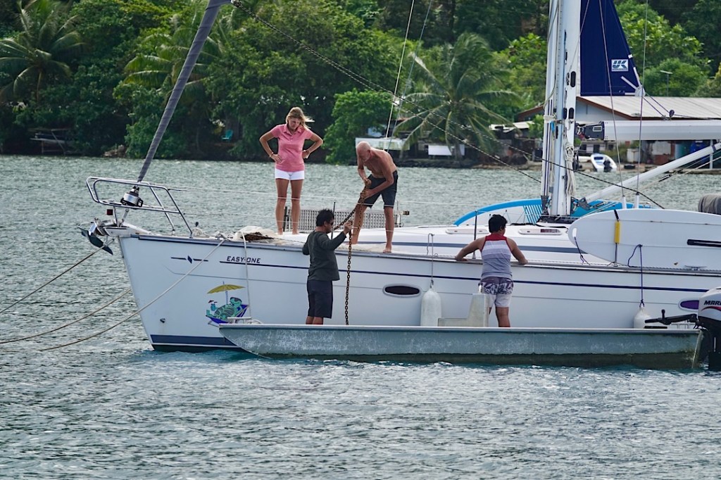 Eine schöne Überraschung gibt’s dann auch noch. Ingo hatte Landry gefragt, ob er auf der Perlfarm Verwendung für die aussortierte alte Ankerkette der Easy One hätte oder sonst jemanden wüsste, dem er sie überlassen kann. Nach etwas Überlegung kommt Landry bei uns am Ankerplatz vorbei. Typisch polynesisch: Geschenk und Gegengeschenk. 100 m Ankerkette wandern in Landrys Boot, dafür wechselt ein wunderschönes Armband auf die Easy One.