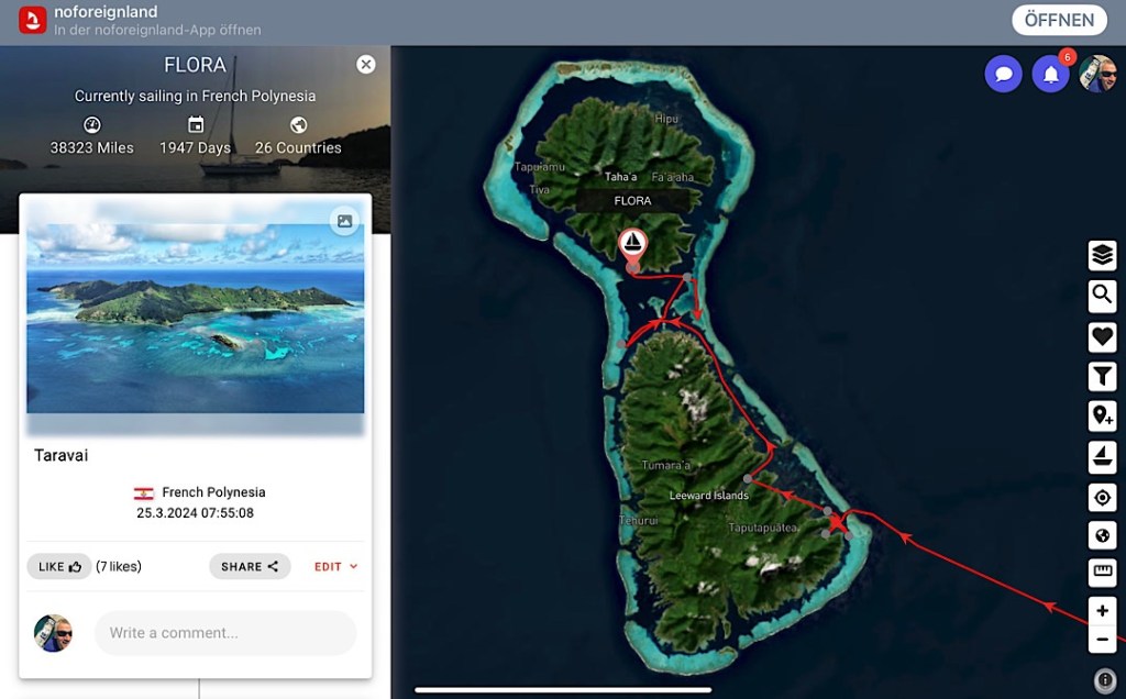 Unser nächster Ankerplatz liegt im Nordwesten von Raiatea. Um dorthin zu gelangen, fahren wir innerhalb des Riffes nach Norden. Wir passieren unter Segeln den Hauptort Utoroa und melden uns per Telefon bei der Flughafensicherheit. Boote mit einer Masthöhe über 20 m sind dazu verpflichtet, weil der an der Nordpitze der Insel liegende Flughafen von einem Sperrgebiet und einer weiteren Sicherheitszone umgeben ist. Aber wir bekommen freie Fahrt signalisiert und segeln durch die Tearearahi-Passage zwischen zwei innerhalb der Lagune liegenden Riffen hindurch zum Ankerplatz im Nordwesten von Raiatea.