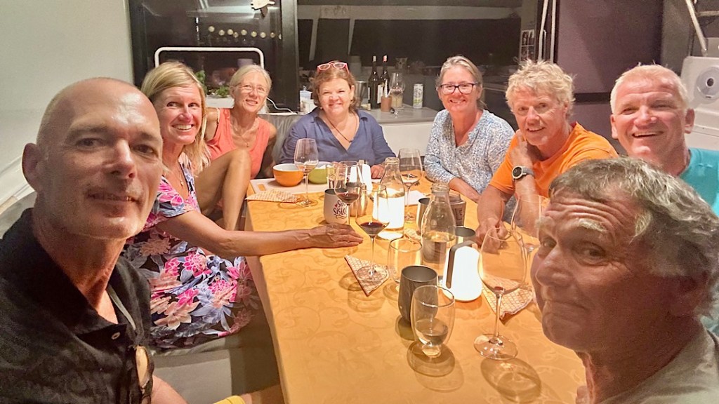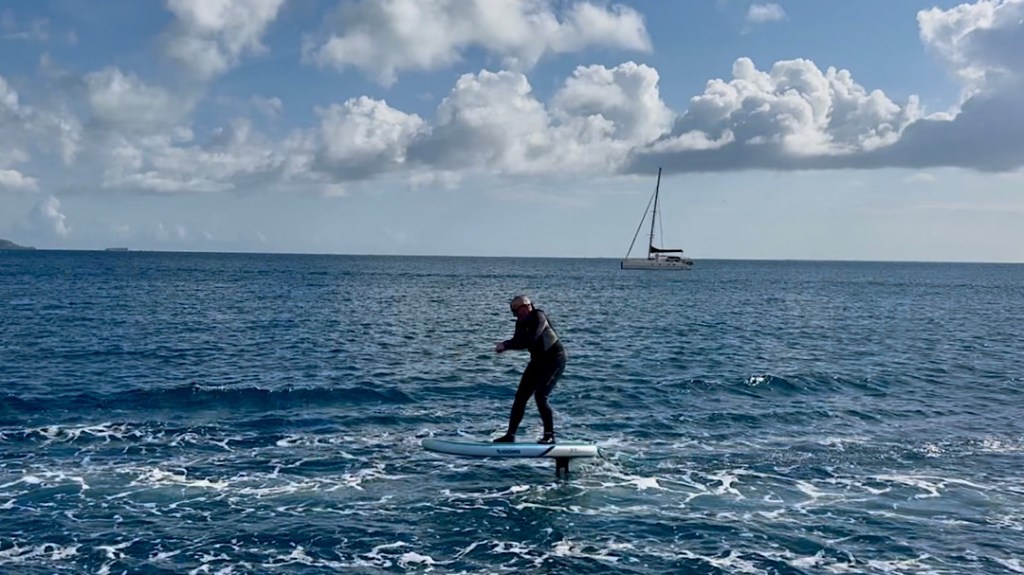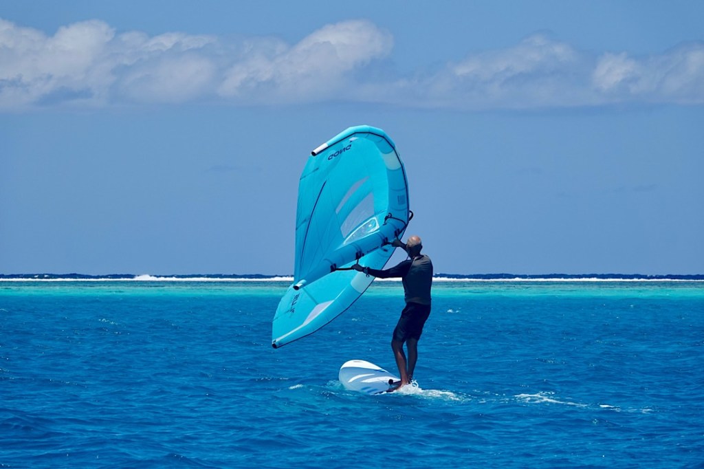 Der Wellenschutz hinter dem Riff und der gleichzeitig fast ungehindert darüber streichende Wind bieten gute Bedingungen, ein paar weitere Basisübungen für das Wingfoilen zu absolvieren. Die Kernelemente muss ich leider erst noch einzeln trainieren. Und so ziehen mich mal Wiebke, mal Ingo auf dem Foilboard hinter unserem Dinghy, jederzeit bereit, sofort Gas weg und den Gang heraus zu nehmen, wenn ich auf dem kippeligen Board mal wieder nicht mehr das Gleichgewicht halten kann. Immerhin, das foilen (wenn also die Unterwasserflügel das Board von der Wasseroberfläche lösen und “schweben” lassen) klappt inzwischen besser. Das heißt, die Zeit zwischen meinen spektakulären Abstürzen schleicht sich sekundenweise nach oben.