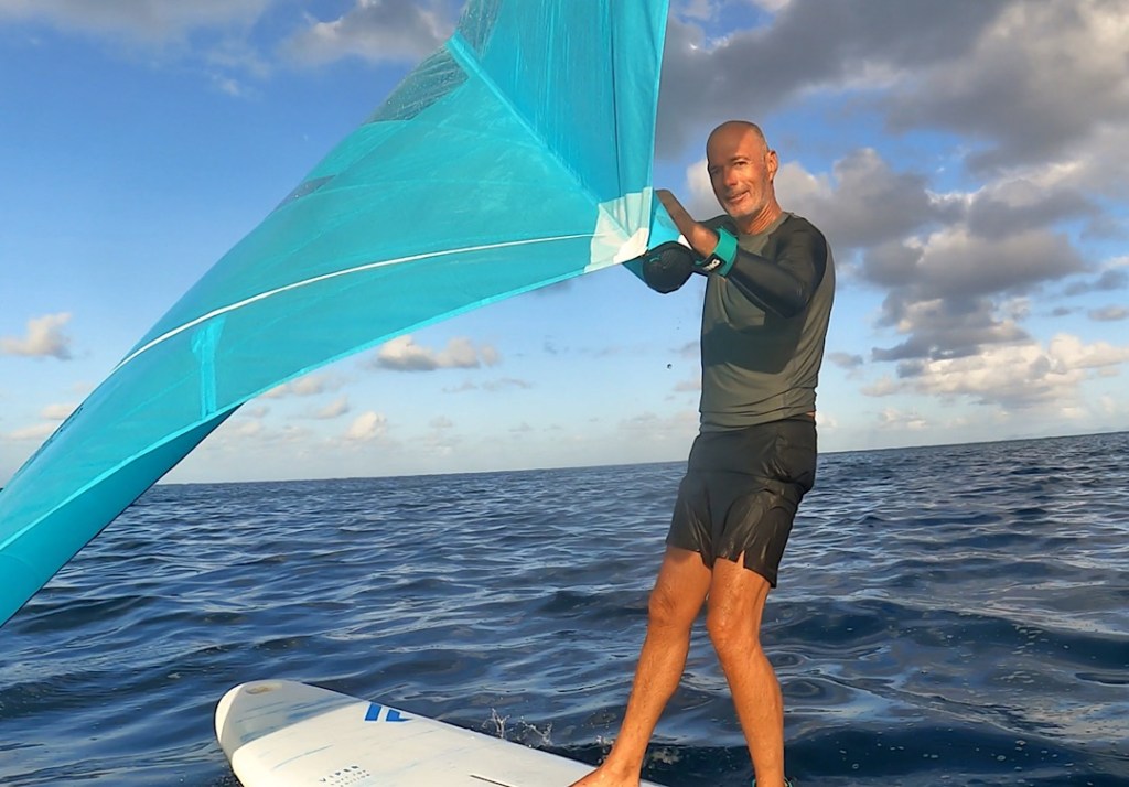 Die zweite Kernübung ist der Umgang mit dem Wing, dem Flügel-Segel. Das kann ich sogar abwechselnd mit Ingo trainieren, denn daran hat auch er Spaß. Dazu nehmen wir Ingos relativ großes Surfbrett (natürlich ohne Mast), es ist wesentlich weniger kippelig als das viel kürzere Foilboard. So können wir besser den Umgang mit dem Wing üben:
