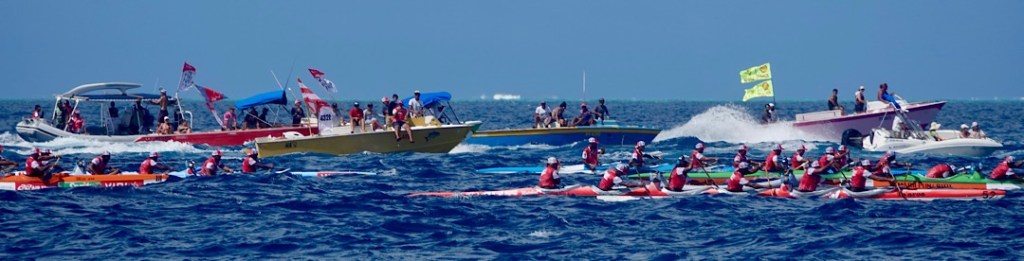 Wie bei einem Uhrwerk stechen die Paddel im Gleichtakt in die Fluten und treiben die schmalen, zerbrechlich wirkenden Gefährte voran. Das geringe, von Sponsorenlogos bedeckte Freibord scheint die Wellen zum Einsteigen geradezu einzuladen. Und doch jagen die Auslegerkanus im Rennmodus über das offene Meer.