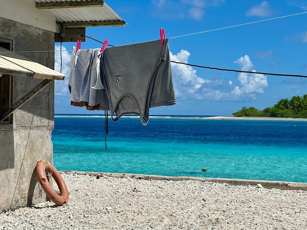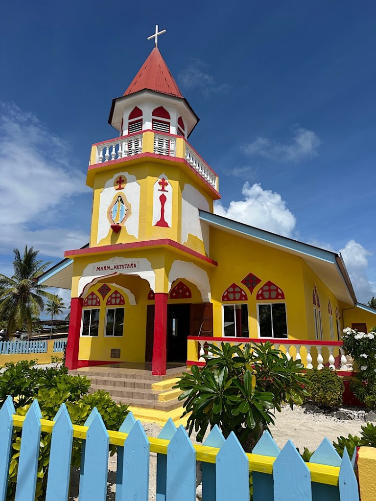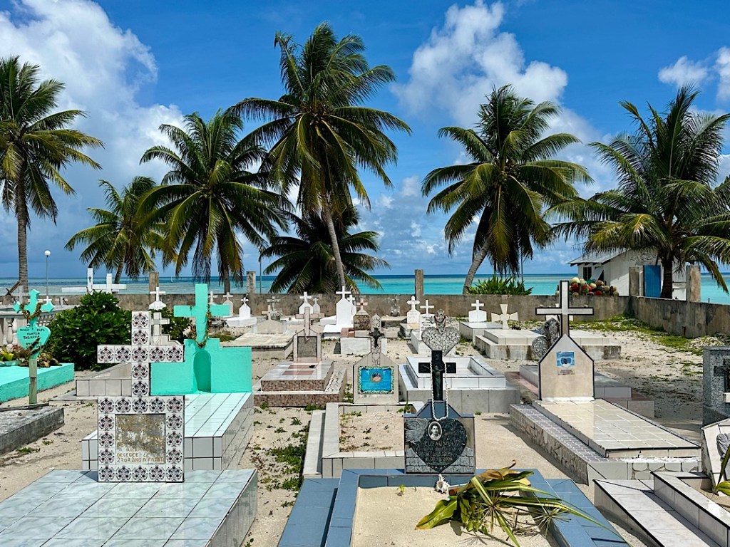 Trotz des vielleicht insgesamt nur etwa einen Kilometer langen Straßennetzes in Form von zwei parallelen Wegen mit ein paar Querverbindungen gibt es auffällig viele E-Bikes. Dieses Phänomen haben wir aber auch schon auf anderen Atollen beobachtet. Immerhin – keine knatternden Mopeds und von den wenigen vorhandenen Autos sehen wir auch keines unterwegs. Es gibt vier kleine Lebensmittelläden, wovon einer allerdings nur die Größe von zwei Telefonzellen hat und mit Kiosk eigentlich schon schmeichelhaft beschrieben wäre. Aber die Grundversorgung ist jedenfalls gesichert und außerdem gibt es auch noch eine Bäckerei für frische Baguettes. 🥖