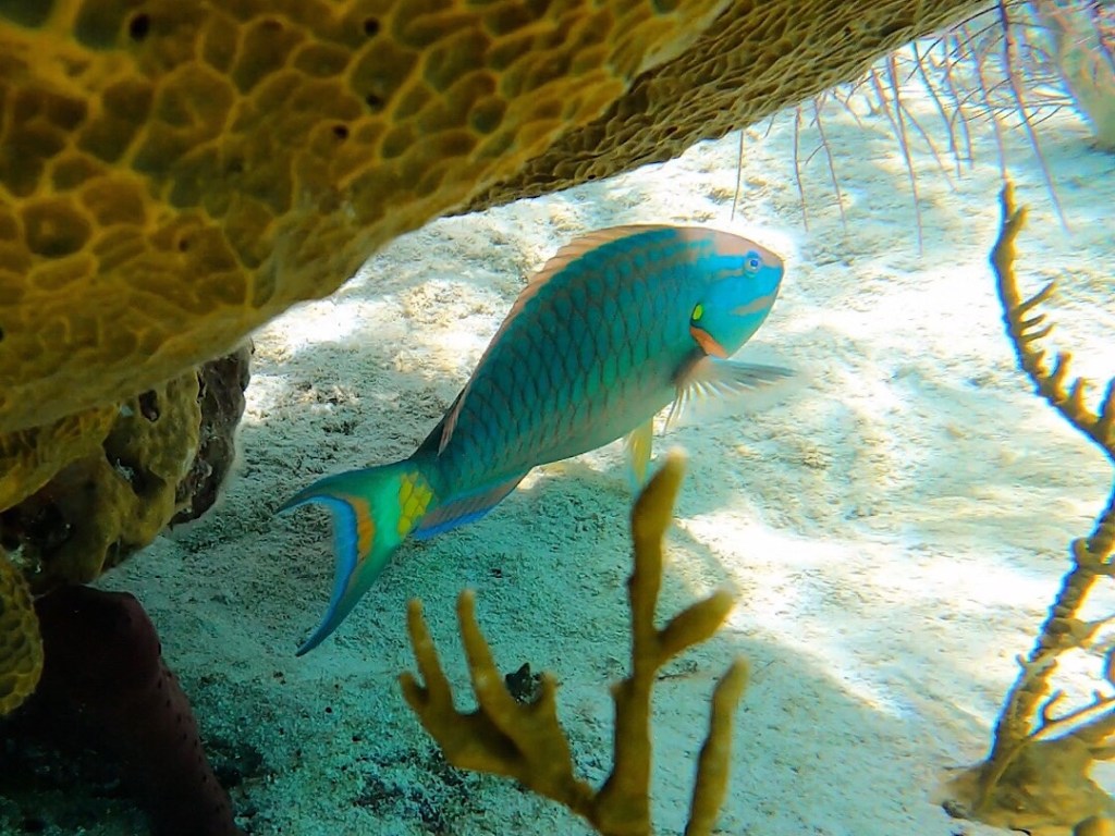 Weiblicher Grüner Papageifischund …… das dazugehörige männliche ExemplarGelbstreifen-Grunzer, französische Grunzer und ganz rechts verschwindet gerade ein Eichhörnchenfisch„Sergeant Majors“, gestreifte RiffbarscheBlaustirn-Kaiserfisch in einem Riesen-Honigschwamm
