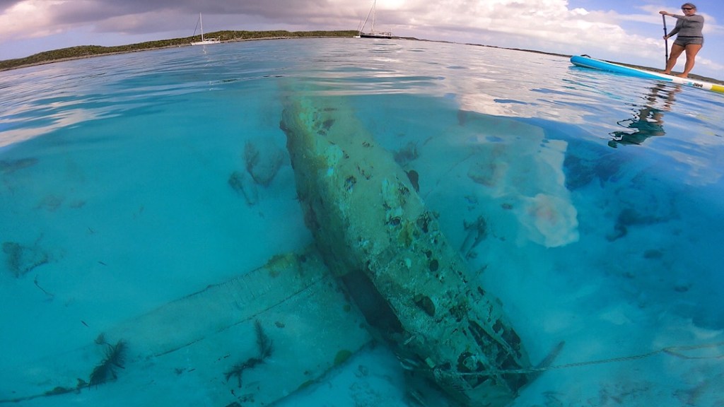 Die vielen weiten und hellen Sandflächen hier verleiten zu der Vermutung, die Unterwasserwelt in den Exumas könnte eine langweilige Ödnis sein – weit gefehlt, es geht mehr als nur das Sammeln von Sand Dollars. Da sind zum einen die vom Menschen ergänzten interessanten Schnorchelziele, bewusst wie bei der Statue der Meerjungfrau am Piano oder unabsichtlich wie bei den diversen Flugzeugwracks, die hier im flachen Wasser gut zu sehen sind. Um nicht wenige davon ranken sich Legenden nach denen die Flieger zum Drogenschmuggel benutzt wurden und direkt mit bekannten Namen des kolumbianischen Medellin-Kartells in Verbindung gebracht werden.