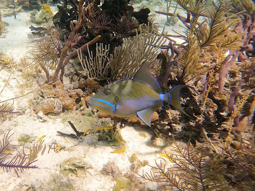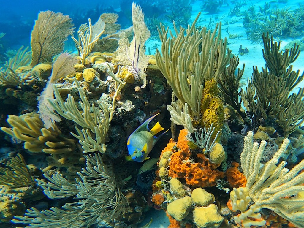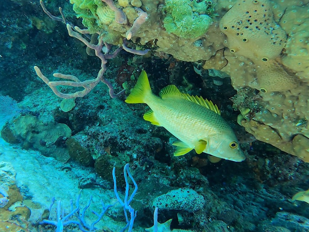 Von ganz klein (hier gleich 4 Flamingozungen auf einer Gorgonie (Fächerkoralle) über größer und auch bunt (Königin-Drückerfisch, dann Nassau-Zackenbarsch, dann Mutton Snapper)