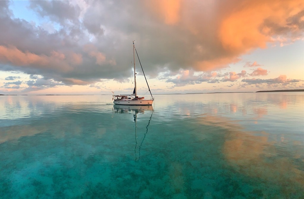 Die paar Meilen, die wir inzwischen in den Exuma weiter nach Norden gesegelt sind, ändern an unseren Solarenergieerträgen natürlich erstmal nichts, allerdings: die Tropen haben wir schon verlassen. Gefühlt ist es trotzdem heißer geworden, denn erstmals seit längerer Zeit haben wir zuletzt ein paar schwachwindige Abende erlebt (wirklich nur zum Sonnenuntergang, tagsüber war feiner raumer bis achterlicher Segelwind 😁). So sah z.B. die Easy One an unserem Ankerplatz vor Lee Stocking Cay von Bord der Flora betrachtet aus: