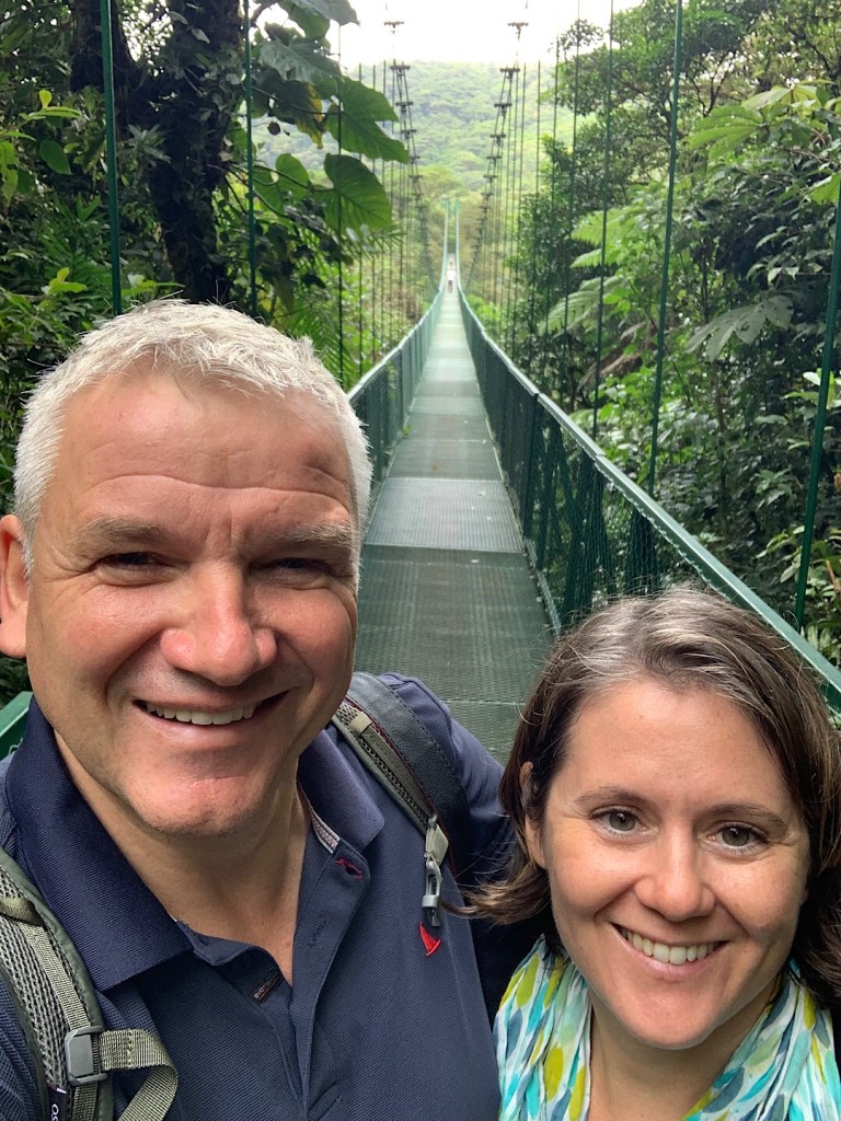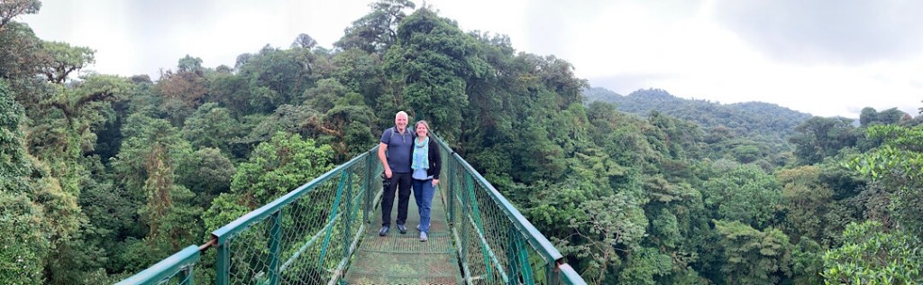 Die Hauptattraktion in Costa Rica ist für uns die Natur. Das sehen die Ticos auch so, nicht ohne Grund ist inzwischen mehr als ein Viertel der Landesfläche geschützt, über 250 Naturschutzgebiete sind ausgewiesen, darunter auch privat finanzierte wie Monteverde. Selbst die menschengemachten Attraktionen in Costa Rica sind eng mit der Natur verknüpft (Achtung: Wortspiel 🤪), denn zu den Highlights zählen insbesondere (Fußgänger-)Hängebrücken über Urwaldtäler und Canopy-Touren. Letztere werden auch “Zipline” genannt. Und das machen wir jetzt im Selvatura Park. Mit Helm, dicken Lederhandschuhen und Klettergeschirr erklimmen wir eine im Regenwald aufgestellte Plattform. Von dort läuft ein gespanntes Stahlseil über die Baumwipfel hinweg bergab in das scheinbar endlose Grün hinein. Das Klettergeschirr wird mit einer Rolle über dem Stahlseil eingeklinkt und los geht die rauschende Fahrt. Die Handschuhe sind für das Bremsen im Notfall gedacht, wir müssen sie nicht einsetzen. Es ist ein irres Gefühl, so über das Blätterdach des Regenwaldes zu fliegen, mit traumhafter Aussicht und einem ziemlichen Adrenalinkick. Nach der ersten kürzeren Strecke stellt sich auch Vertrauen in die “Bremser” ein, die an der jeweils nächsten Plattform den Mechanismus für die Reduzierung der Geschwindigkeit bedienen. Ungebremst möchte man nicht in die sicherheitshalber angebrachten Sportmatten sausen. Insgesamt 13 Kabel umfasst die Tour, das längste ist über eine Strecke von mehr als einem Kilometer gespannt.