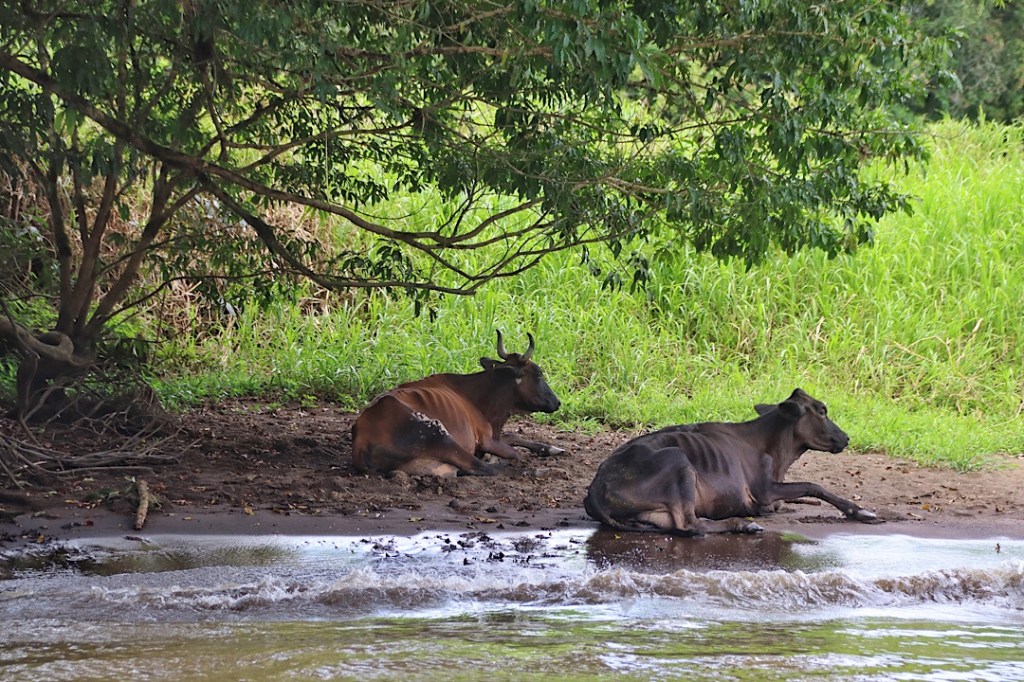 Liegen zunächst noch Kühe auf den Wiesen neben dem flachen braunen Gewässer, wird bald der Dschungel zu beiden Seiten dichter.