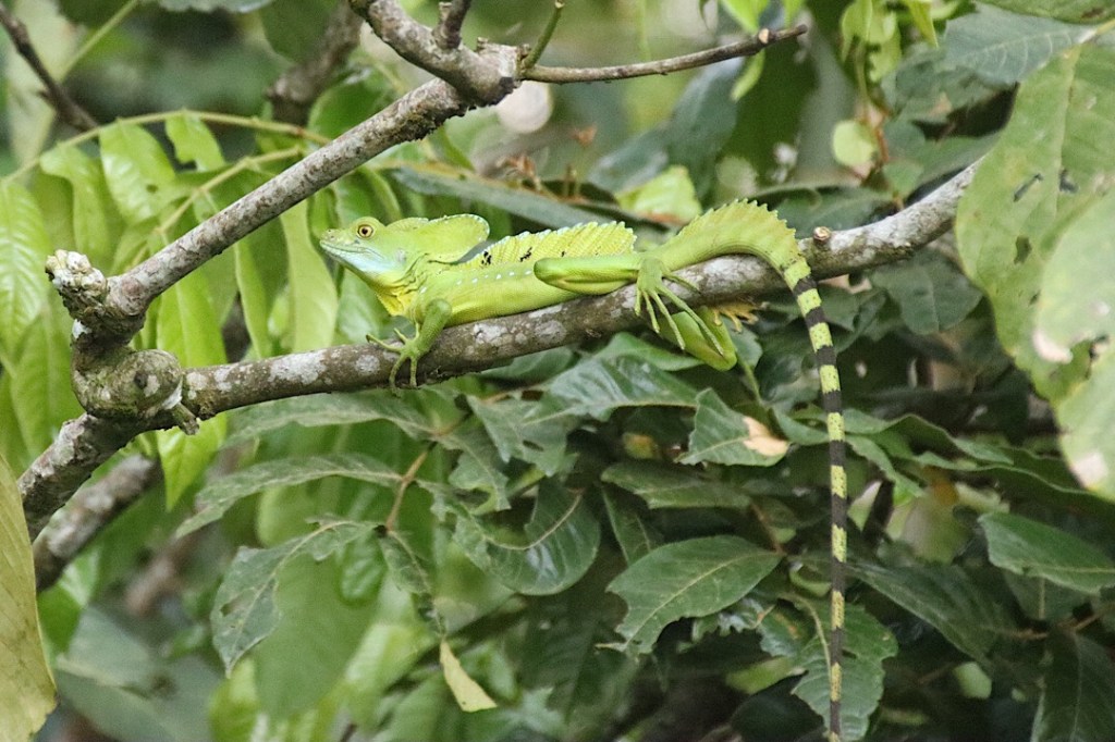Erst läuft uns ein anderer Basilisk über den Weg. Ein Streifen-Basillisk, (auch Jesus-Christus-Basilisk genannt, weil er bei Gefahr auf den Hinterbeinen übers Wasser laufen kann; also mal Versteinerer, mal Erlöser):