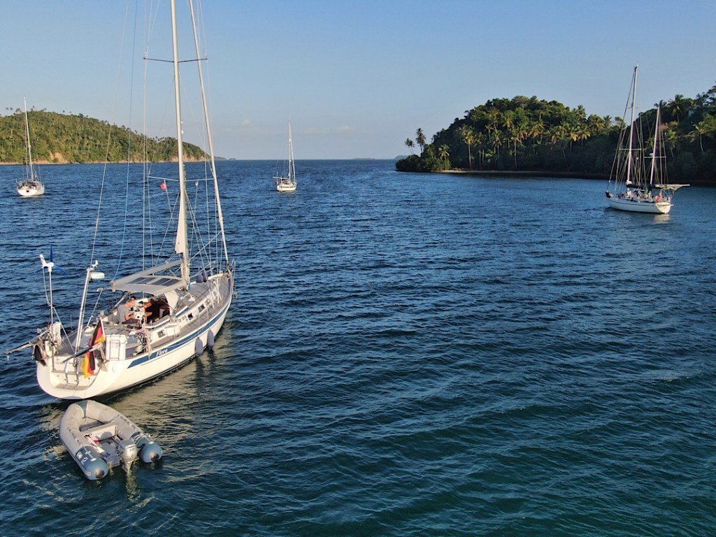 Da ist es dann fast schon müßig zu erwähnen, dass wir an unserem ersten Ankerplatz zurück in den USA die Vairea und die Tropicool vorfinden, die Jollity kommt etwas später an. Und die Escape holt uns zu unserer großen Freude auf dem nächsten Ankerplatz am Cape Lookout ein 😁.