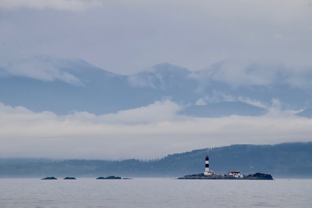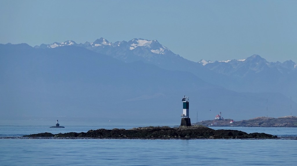Und dann: ist das jetzt ein Wetterfenster? Jedenfalls nutzen wir vorsichtshalber am nächsten Morgen wieder die Tide und fahren die Juan de Fuca weiter hinaus. Mit bis zu 5,5 kn werden wir zwischenzeitlich (zusätzlich zur etwa gleichen Geschwindigkeit durchs Wasser) geschoben, die „Race Passage“ mit dem markanten Leuchtturm auf dem „Great Race Rock“ wird ihrem Namen gerecht.