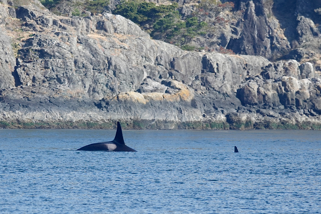 Wegen ihrer charakteristischen Rückenflossen, die bei den Männchen schmaler und gerader sind und bis zu 2 m lang werden können, werden sie auch als Schwertwale bezeichnet. In Europa können Segler die Begegnung mit den Orcas leider nicht mehr uneingeschränkt genießen, da es – zunächst vor Spanien, jetzt aber auch an anderen Orten – zu einer Vielzahl von zerstörerischen Angriffen der Orcas auf die Ruder von Segelyachten gekommen ist, mehrere Segelboote sind sogar gesunken. Hatten zunächst auch dort nur wenige Mitglieder einer einzelne Orcafamilie dieses Verhalten gezeigt, hat es sich inzwischen dort weiter verbreitet. Hier in BC und an anderen Orten der Welt (Orcas kommen in allen Weltmeeren vor) zeigen die Schwertwale dieses Verhalten aber (bisher) nicht. Es ist also um so schöner, hier jetzt ohne derartige Befürchtungen so viele dieser wunderschönen Tiere sehen zu können.